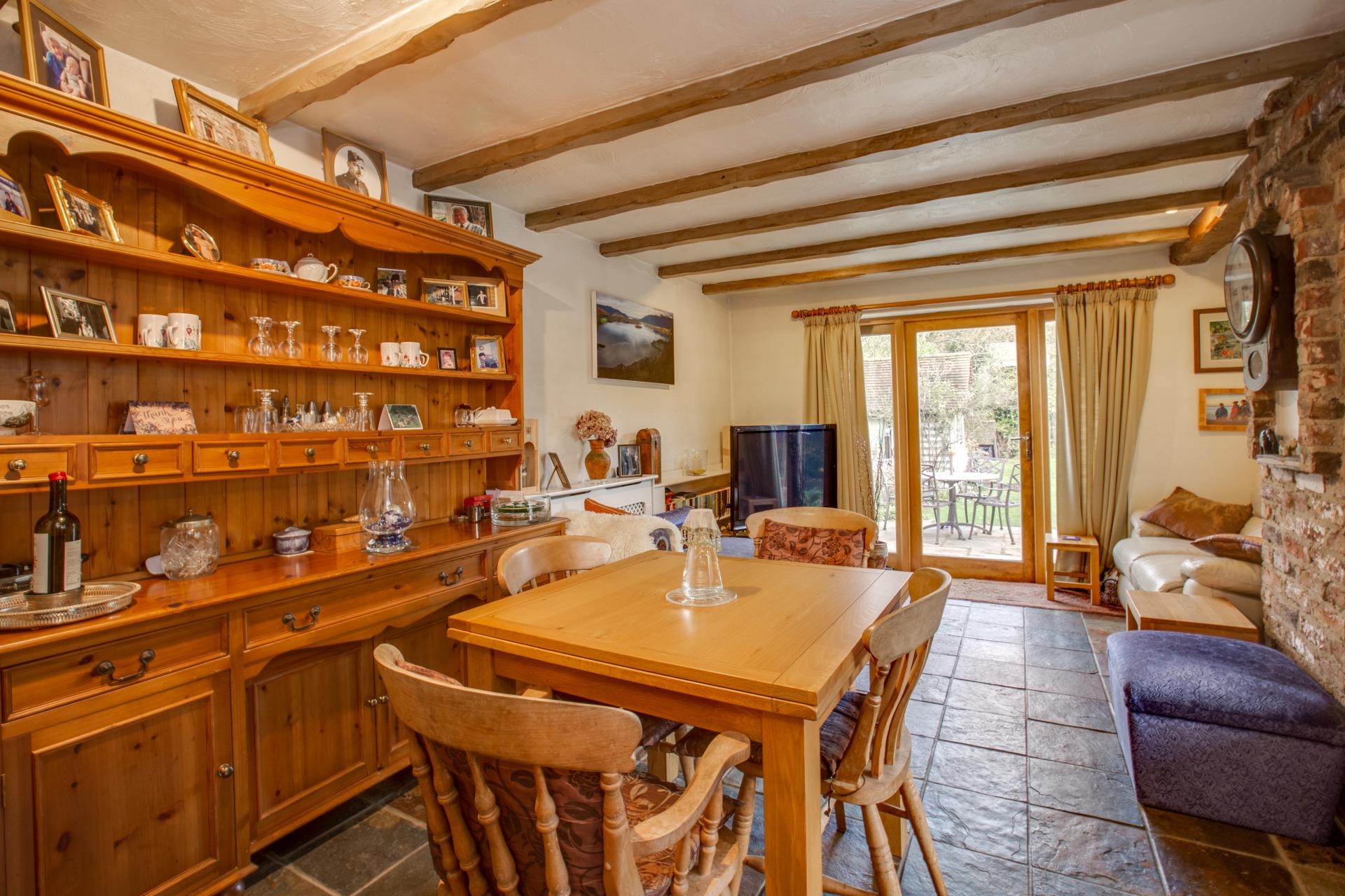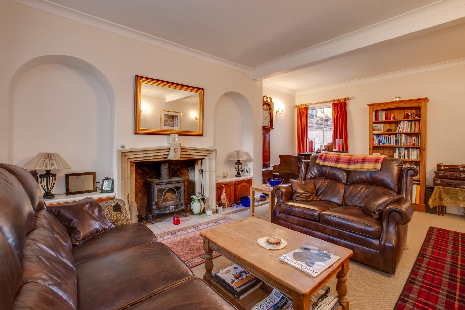 The front door leads into the Entrance Hall with a door to the Cloakroom, Study and staircase to first floor and further door into the Living Room. The Living Room is a double aspect room with a solid fuel wood burner. To the rear of the property is a Breakfast Room/Family Room that opens into the Kitchen with a gas Rayburn which also controls the heating. From the Kitchen there is a small Utility Area and a door leading from the family Room onto the rear patio and delightful garden.