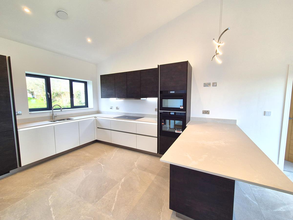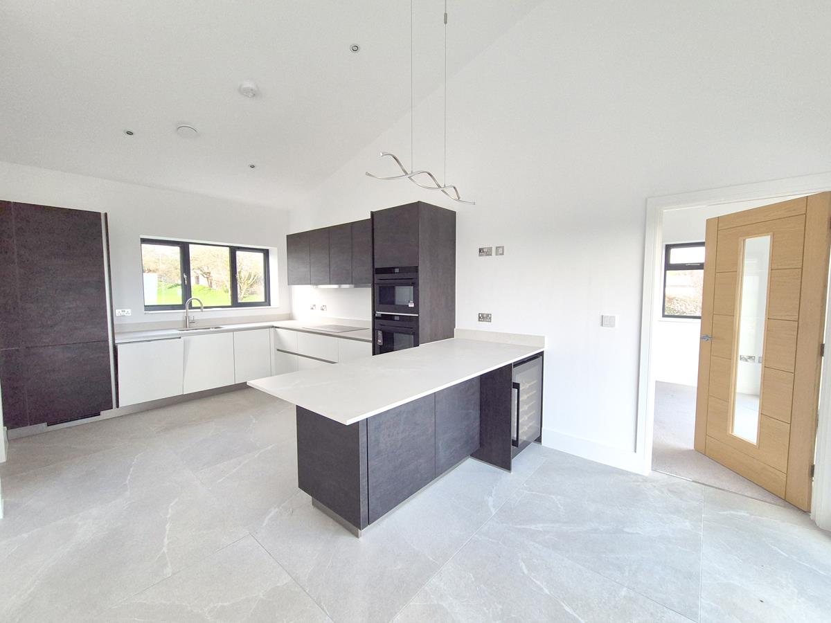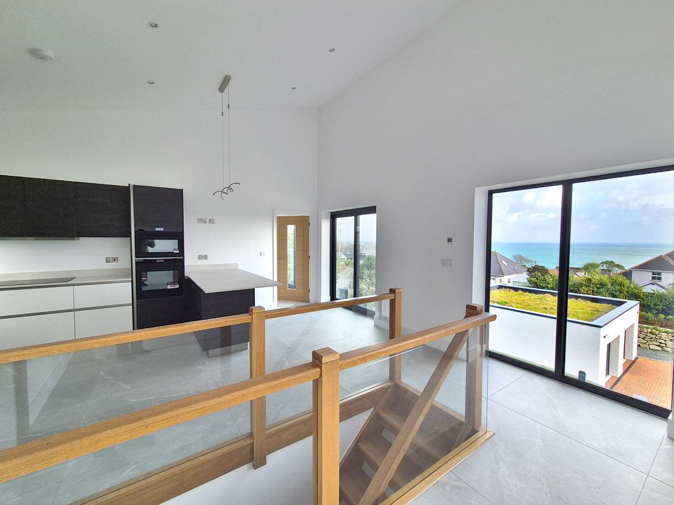Kitchen Area - A contemporary kitchen comprising working top surfaces incorporating a one and half bowl sink unit with drainer and mixer tap over, cupboards and drawers under and wall cupboards over. An array of built-in appliances include an oven, microwave, hob with hood over, dishwasher, fridge/freezer and a wine cooler. There is an outlook to the front and rear and a Juliette balcony takes full advantage of the sea views over other properties. There is a door to the snug and a door to the utility room. Overall a high end kitchen which is visually striking and offering a real wow factor!