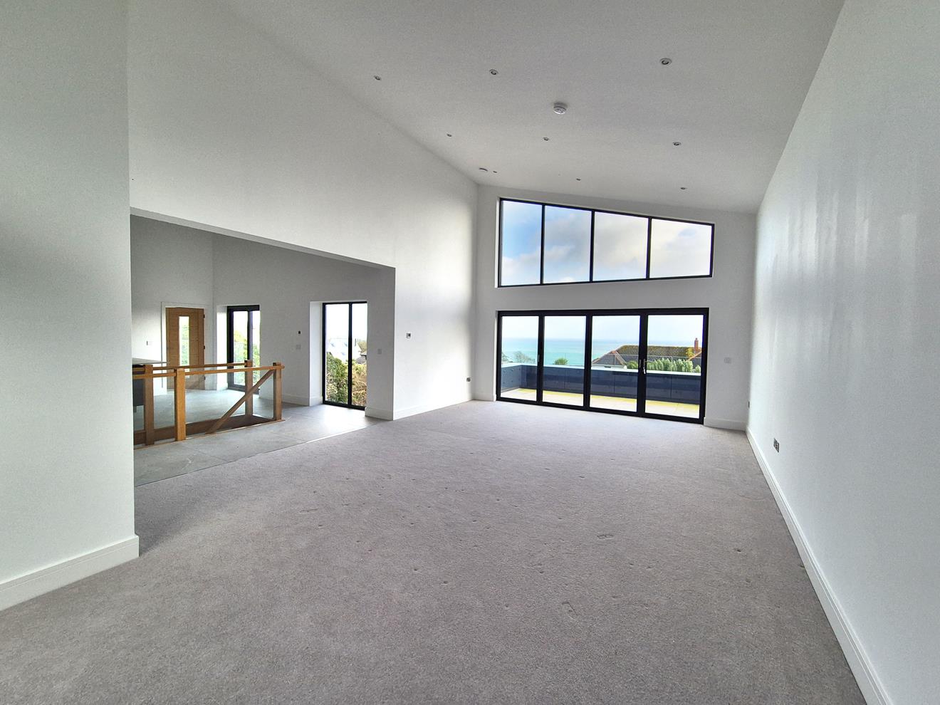 First Floor - 11.05m x 8.15m (narrowing to 3.89m) (36'3" x 26'9" - A fabulous open plan space with vaulted ceiling, bi-fold doors to the front and rear elevated balconies with the front balcony in particular, taking full advantage of the views across the village and out to sea.