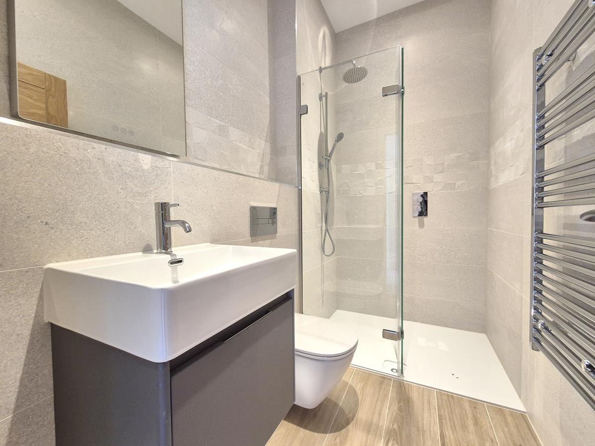 En-Suite - En-suite shower room comprising a walk-in shower cubicle with both rain and flexible shower head over, a w.c. with concealed cistern and a wash basin with mixer tap over and drawer under. There is a tiled floor, tiled walls and a heated towel rail.