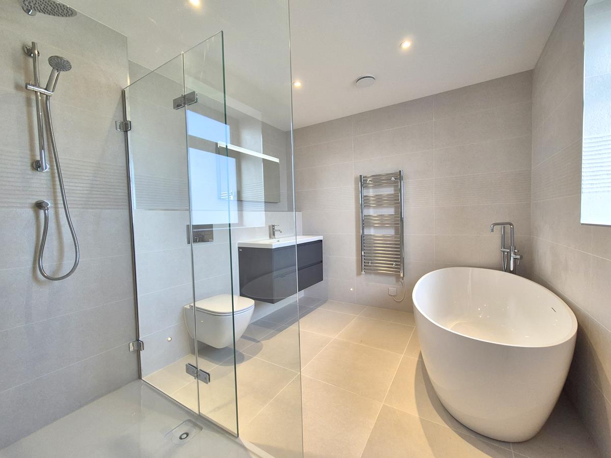 En-Suite - Comprising a free standing bath with mixer tap and flexible shower hose over, a wall mounted wash basin with mixer tap over and drawers under, w.c. with concealed cistern and a walk-in shower cubicle with both rain and flexible shower head. There is a tiled floor, tiled walls, heated towel rail and a frosted window.