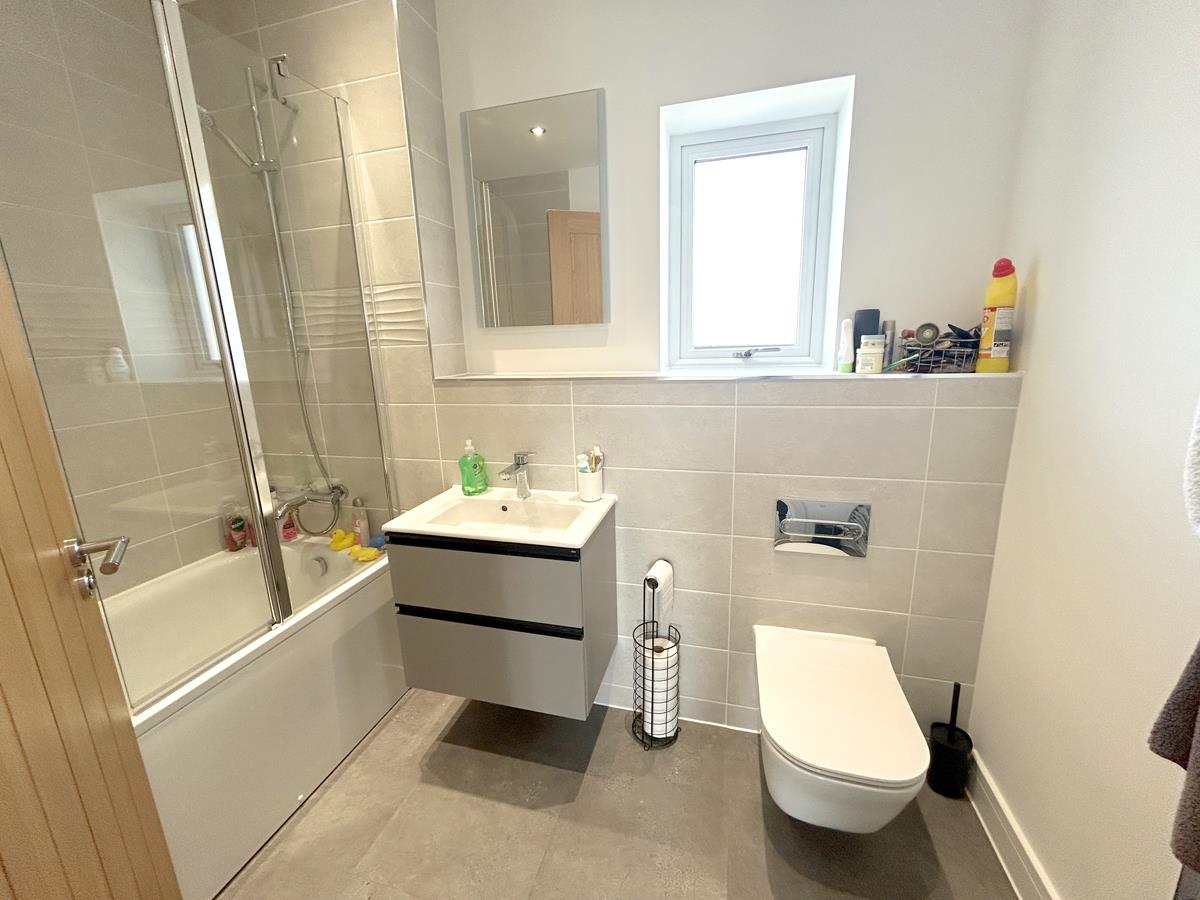 Bathroom - A stylish, contemporary bathroom suite featuring a panelled bath with glass screen and shower over, complemented by attractive tiling. The space includes a vanity-style wash hand basin with mirror above, a dual-flush concealed cistern WC, and an obscure glazed window providing natural light. Finished with laminate tile-effect flooring and a heated towel rail.