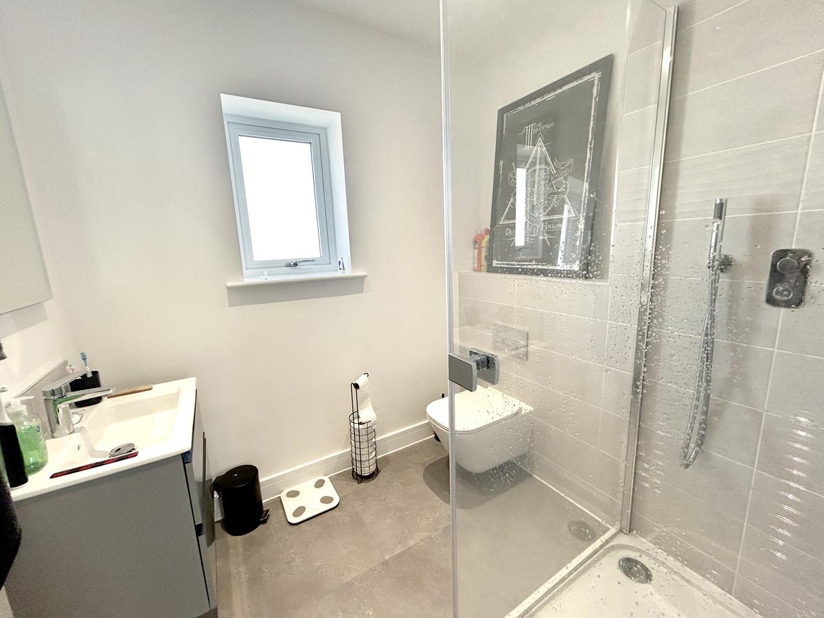 En-Suite Shower Room - With a generous walk-in tiled and glazed shower cubicle, vanity style wall mounted wash hand basin with mirror over, w.c. with dual flush and concealed cistern, heated towel rail, obscure glazed window and tile effect laminate flooring.