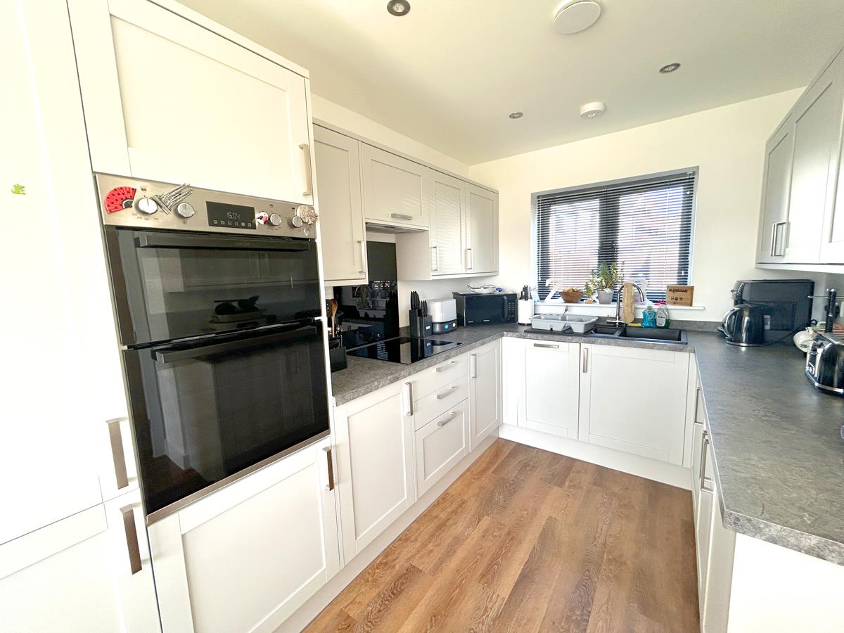 Kitchen/Diner - 5.5 x 2.8 (18'0" x 9'2") - The property features a beautifully appointed contemporary kitchen/dining room, fitted with a stylish range of grey units complemented by granite-effect worktops incorporating a one-and-a-half bowl sink and drainer with mixer tap, a touch-control ceramic hob with a sleek smart glass black splashback and extractor hood over. The kitchen offers a comprehensive range of base, drawer, and wall-mounted units, along with a full suite of integrated appliances including a double oven, fridge/freezer, dishwasher, and washing machine. Wood-effect laminate flooring, while recessed downlighters provide modern lighting. To the dining area, a glazed sliding door with matching glazed side panel opens directly onto the rear garden, creating a light and sociable space ideal for both everyday living and entertaining.