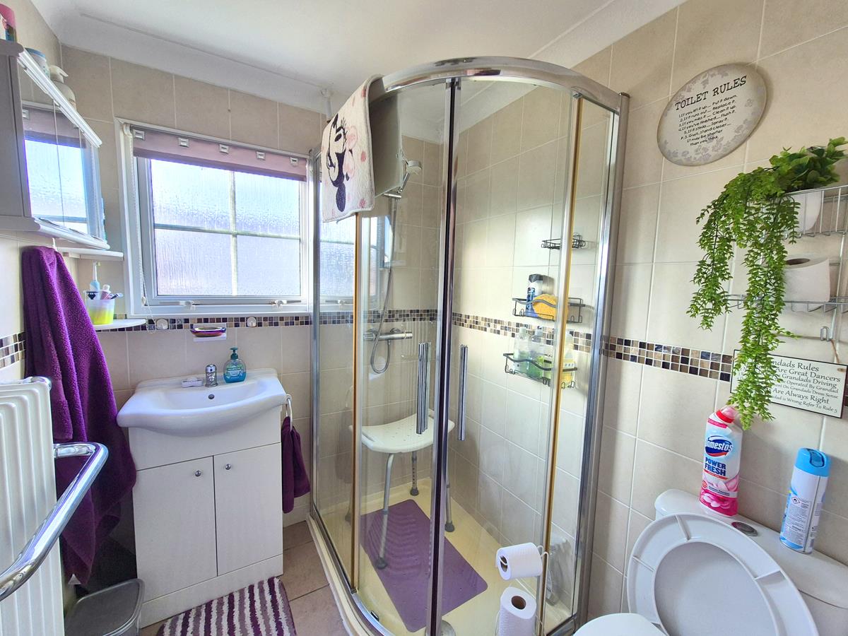 Shower Room - Comprising a shower, close coupled W.C. and a wash basin with mixer tap over and cupboards under. There are tiled walls and a tiled floor.