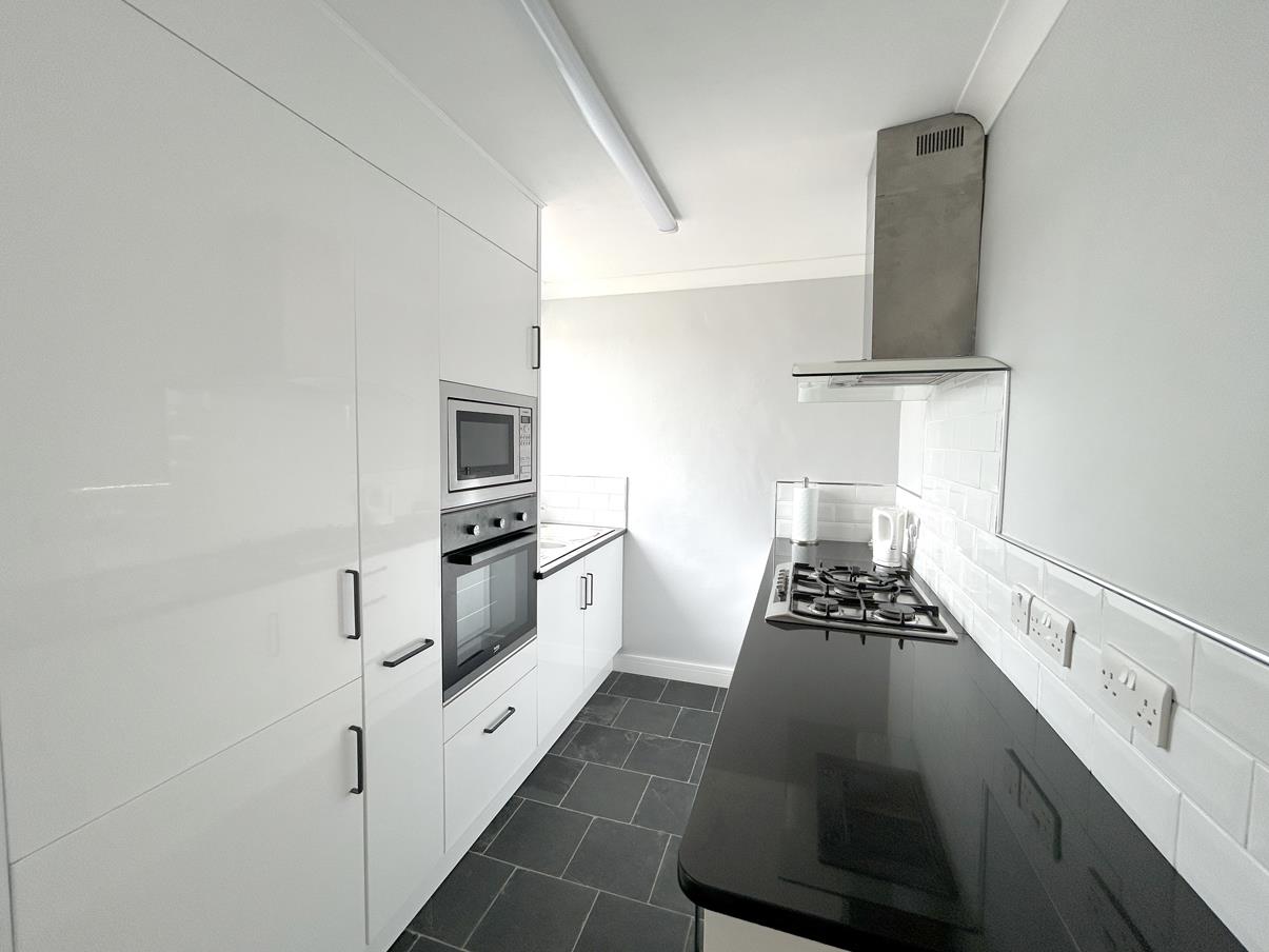 Kitchen - 3.45 x 2.12 (maximum measurements) (11'3" x 6'11" - With a newly fitted white high gloss kitchen with polished stone worktops that incorporate five burner gas hob with central wok burner and with stainless steel and glass chimney hood over and a one and half bowl stainless steel sink drainer unit with mixer tap and attractive white metro style tiling . A mix of base and drawer units under with wall units over, built in oven, fridge/freezer and microwave. A window overlooking the rear aspect with attractive slate tiling to the floor. A step leads down to a rear porch area with slate tiling again and a service door to the outside and opening to the utility room.