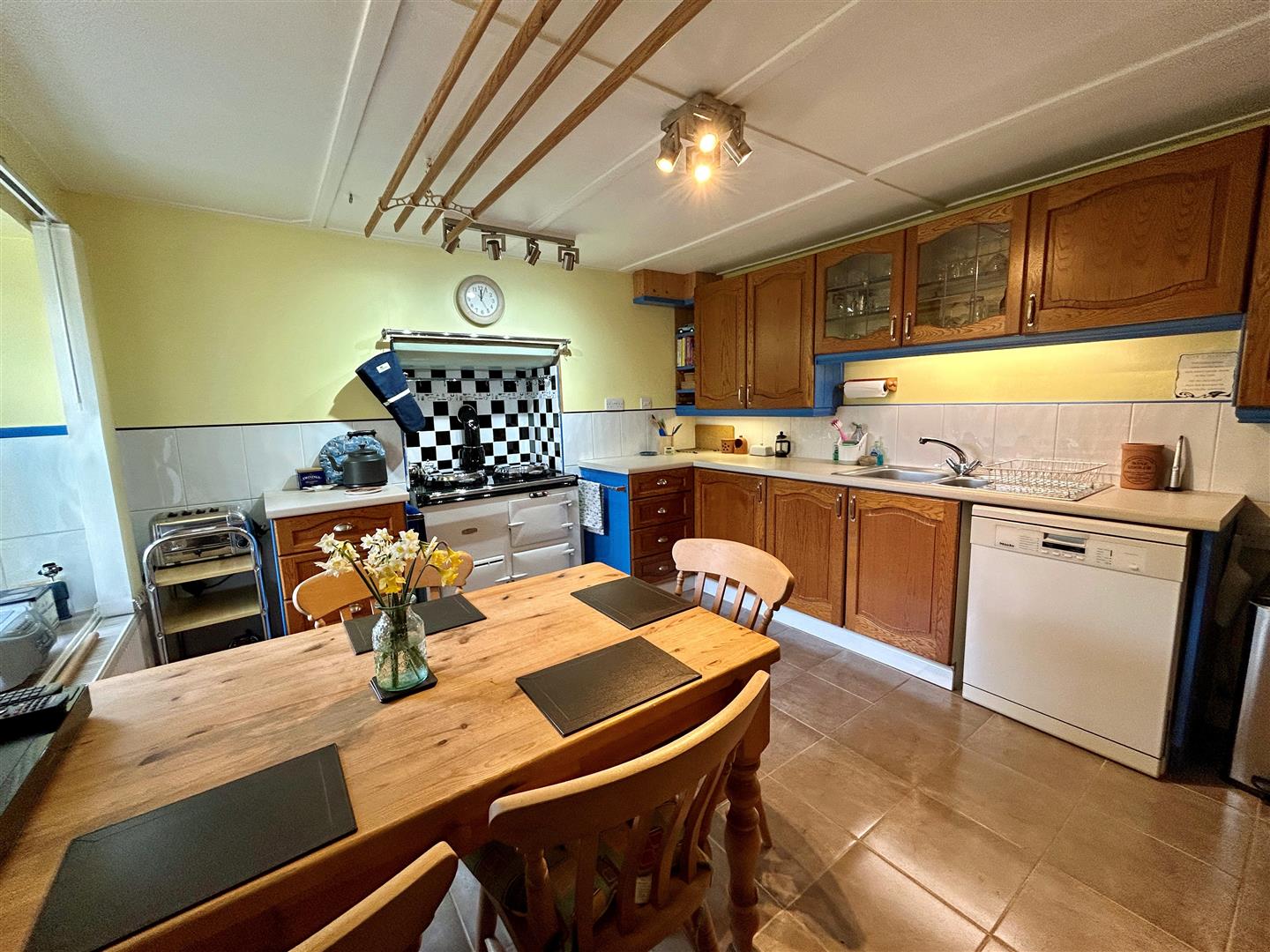 Kitchen/Breakfast Room - 3.77 x 3.41 (12'4" x 11'2") - A lovely space with wood effect fitted kitchen comprising work tops incorporating a one and a half bowl stainless steel sink drainer, mixture of base and drawer units under, wall units over, tiled alcove with gas powered Aga, sash window to the side aspect, tiling to the floor and the room is lit by a spotlight arrangement with doors to -