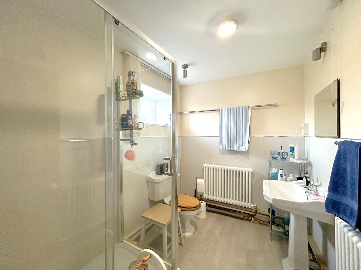 Shower Room - With a suite that comprises of a generous glazed walk in shower with easy clean splashback, close coupled W.C., pedestal wash hand basin, window to the rear aspect, vinyl effect flooring and a shaver socket.