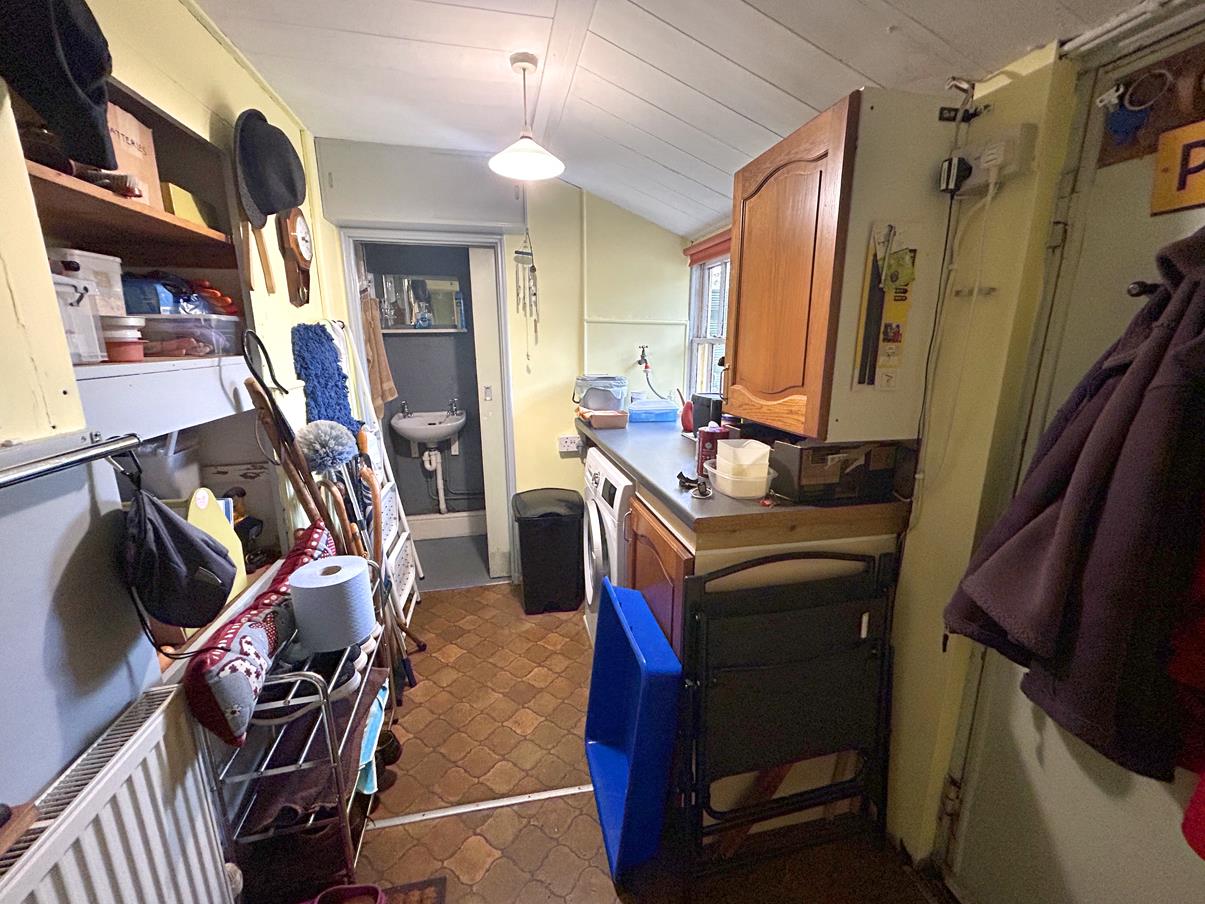 Utility Room - 2.65 x 1.73 (8'8" x 5'8") - A useful space with work top having cupboard under, wall cupboard over, space is provided for a washing machine. There are a number of feature shelves, wood paneling to the ceiling and window to the rear aspect with sliding door to -