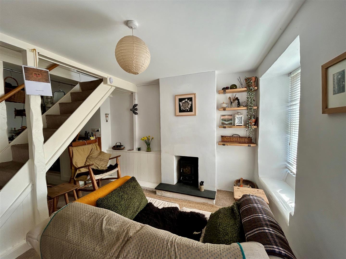 Lounge - 3.63 x 3.4 (max measurements) (11'10" x 11'1" (max - A lovely space with log burner set on a slate hearth, window to the front aspect with a window seat arrangement whilst stairs rise to the first floor with an opening through to-
