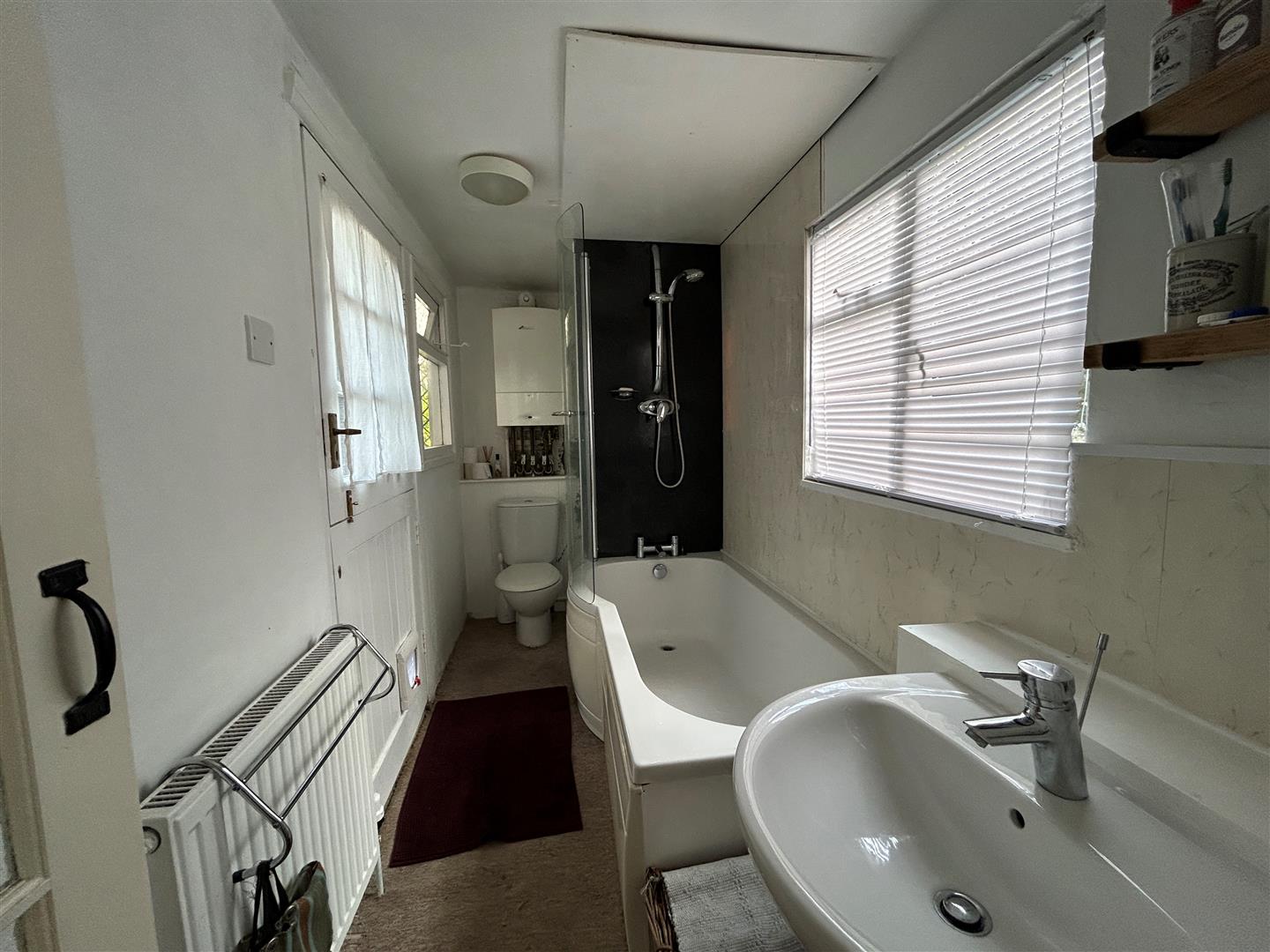 Bathroom - Being nicely appointed with a white suite that includes a P-shaped bath with shower screen at one end and easy clean splashbacks to the rear and side, wash hand basin, dual flush W.C., window to the side aspect, feature shelving, the room houses the Worcester mains gas boiler and there is a further window along with a stable style half glazed door leading to the rear courtyard.