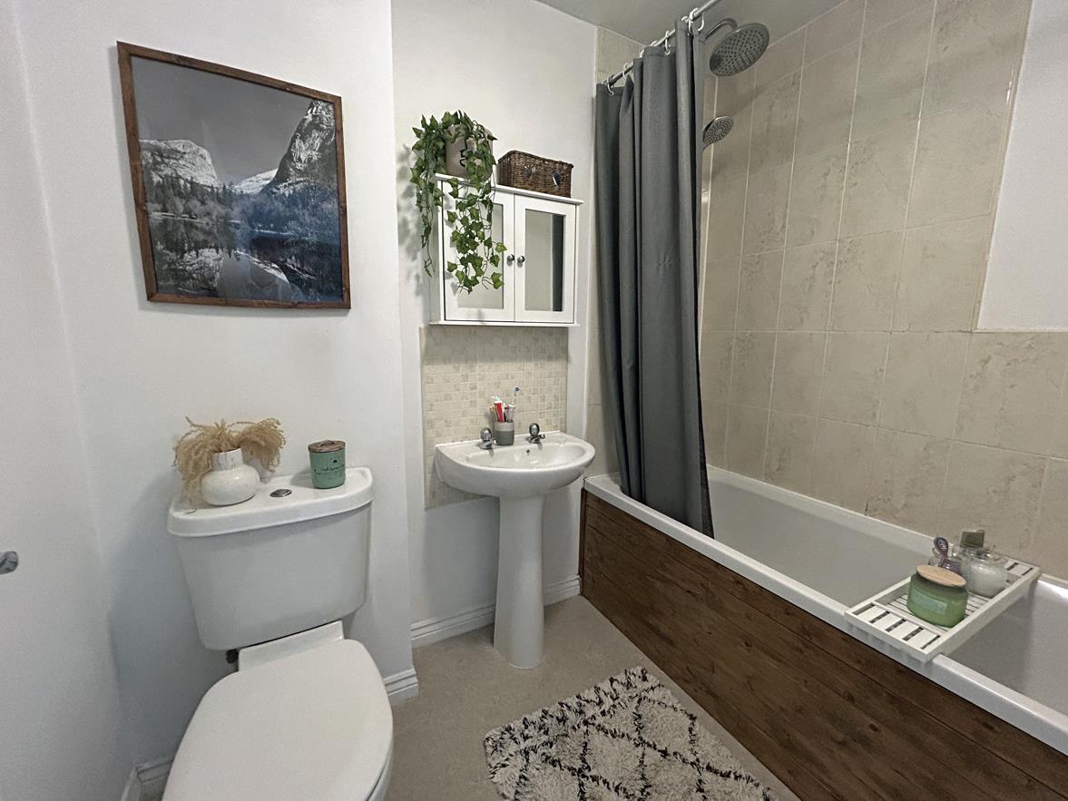 Bathroom - With white suite comprising wood effect panelled bath with attractive tiled splashback and shower over with rainfall style drencher head, pedestal wash handbasin with tiled splashback with mirrored medicine cabinet over, dual flush W.C., extractor and vinyl flooring.