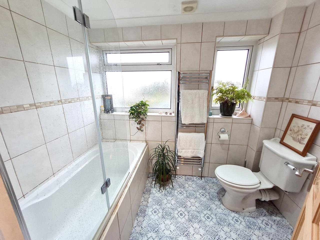 Bathroom - With a modern white suite comprising a bath with electric shower over, concertina glass shower screen, a low-level w.c and pedestal wash handbasin with a mirrored medicine cabinet over. There is tiling to the walls, patterned vinyl flooring, a chrome ladder style towel rail, recessed spotlighting, an extractor and twin obscure glazed windows to the rear.