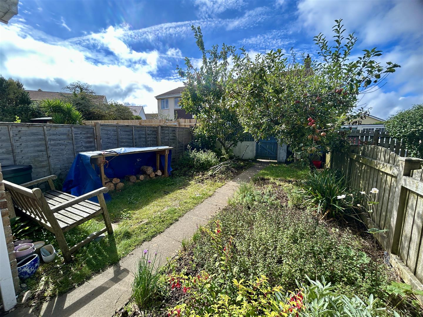 Outside - A gate open out into the front garden from where a pathway leads up to the front doorstop. There is an area for recycling and an area of lawn with borders to the side.