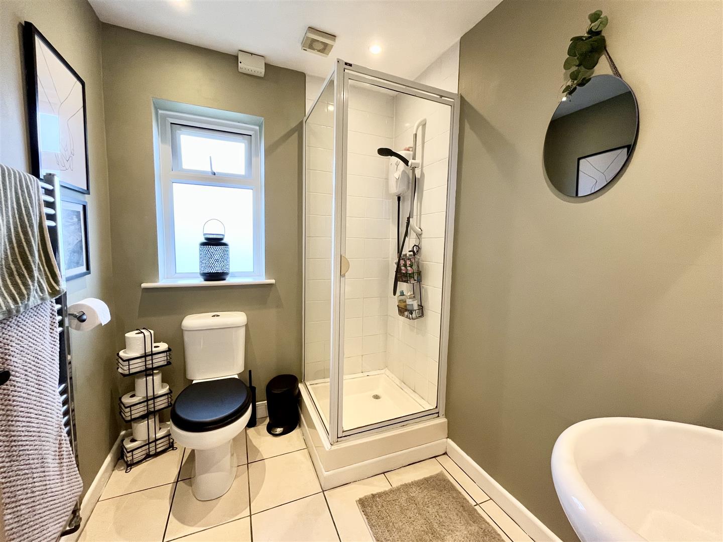 Shower Room - 2.06m x 1.73m (6'9 x 5'8) - With single shower cubicle, low level W.C, wash hand basin, heated towel rail, tiled floor and obscured window to the side.
