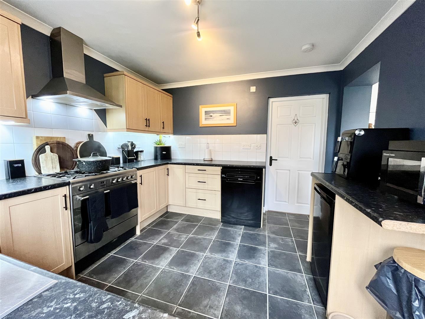 Kitchen - 3.43m x 3.18m (11'3 x 10'5) - A practical space fitted with a range of wall and base units and drawers, roll edge work surfaces incorporating a stainless steel sink with draining board and mixer tap. There is also a large electric oven with five ring gas hob and cooker hood over space for a dishwasher and fridge freezer. A window overlooks the rear garden and there is also a patio door leading out to the rear garden.