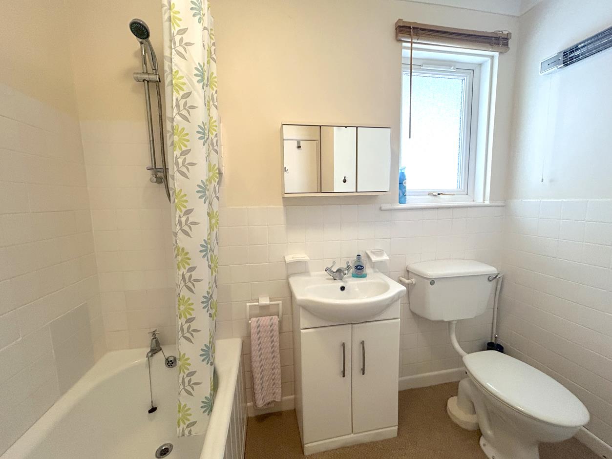 Bathroom - This L-shaped room has a suite that comprises panelled bath with tiled splash back and an electric shower over and a w.c. There is a wash hand basin set into a vanity unit, part tiling to the walls and a window to the side aspect.