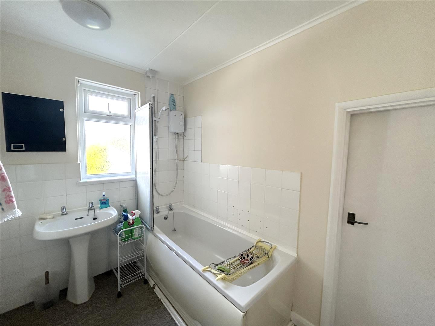 Bathroom - A panelled bath with Triton shower over and tiled splashback with a glass screen, wash hand basin with tiled splashback, obscure glazed window to the side aspect and a door opens up to a useful eaves storage area with light.
