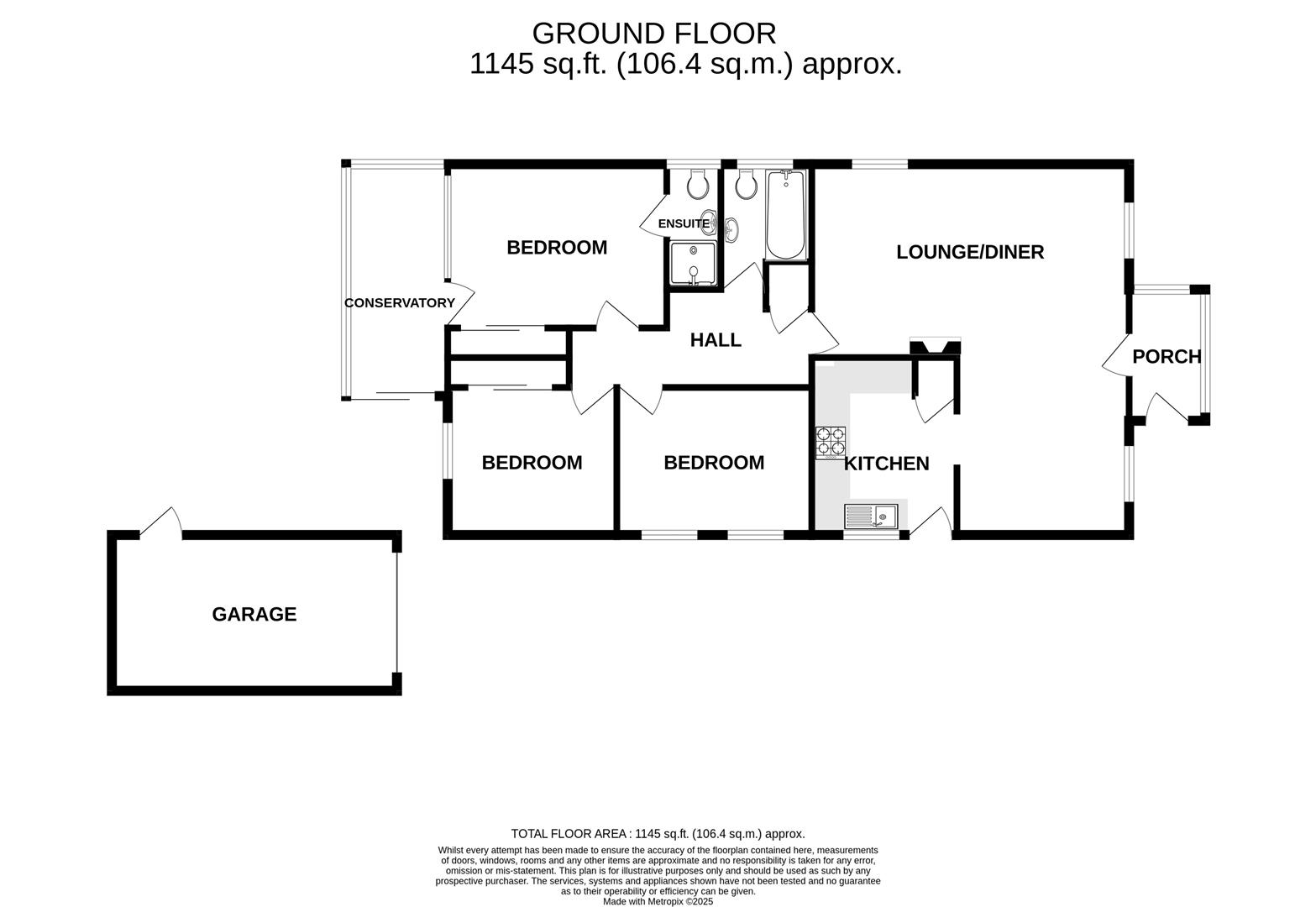 In brief, the accommodation comprises a kitchen, lounge/diner, front porch, hall, bathroom, conservatory and three bedrooms.