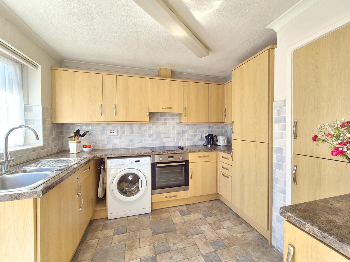 Kitchen - 3.05m x 2.59m (10' x 8'6") - Comprising working top surfaces incorporating a one and a half bowl sink unit with drainer, cupboards and drawers under and wall cupboards over. There is a built-in oven (not working) with hob and hood over, fridge/freezer, partially tiled walls, outlook and door to the side and sliding door to lounge/diner.