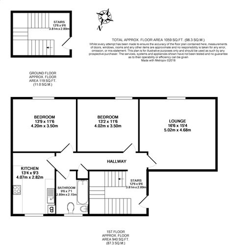 Accommodation – Entrance stairway to First floor flat. Lounge, two bedrooms, Kitchen and Bathroom.