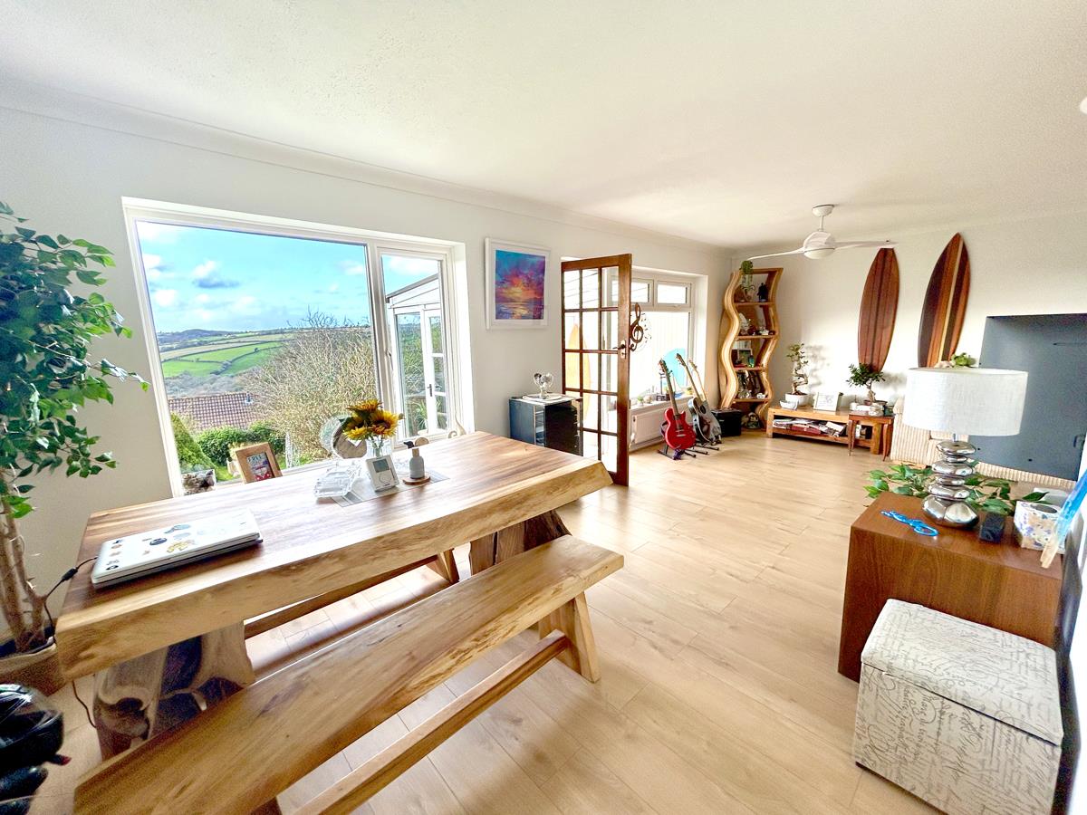 Lounge/Diner - 6.99m x 6.78m maximum measurements (22'11" x 22'3" - A generous dual aspect room with windows to the front and rear, the latter of which enjoys the panoramic views out over the Cober valley and onwards to open countryside. There is an open fire set on a slate effect hearth with wood mantel over, smart wood effect flooring a further window through to the conservatory with door to the