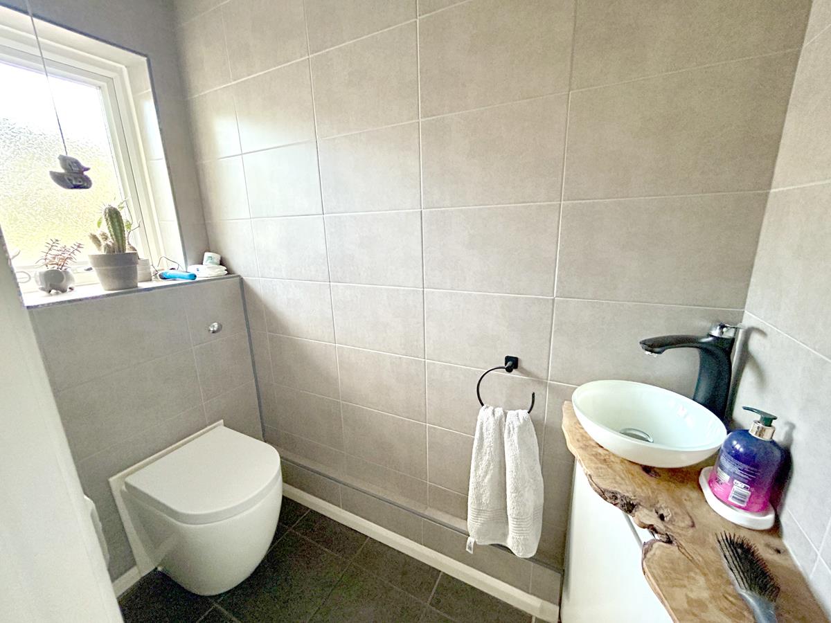 Cloakroom - With w.c. with concealed cistern, slate effect flooring, wash hand basin set on a natural wood base with storage under and attractive tiling to the wall and an obscured window to the front aspect.