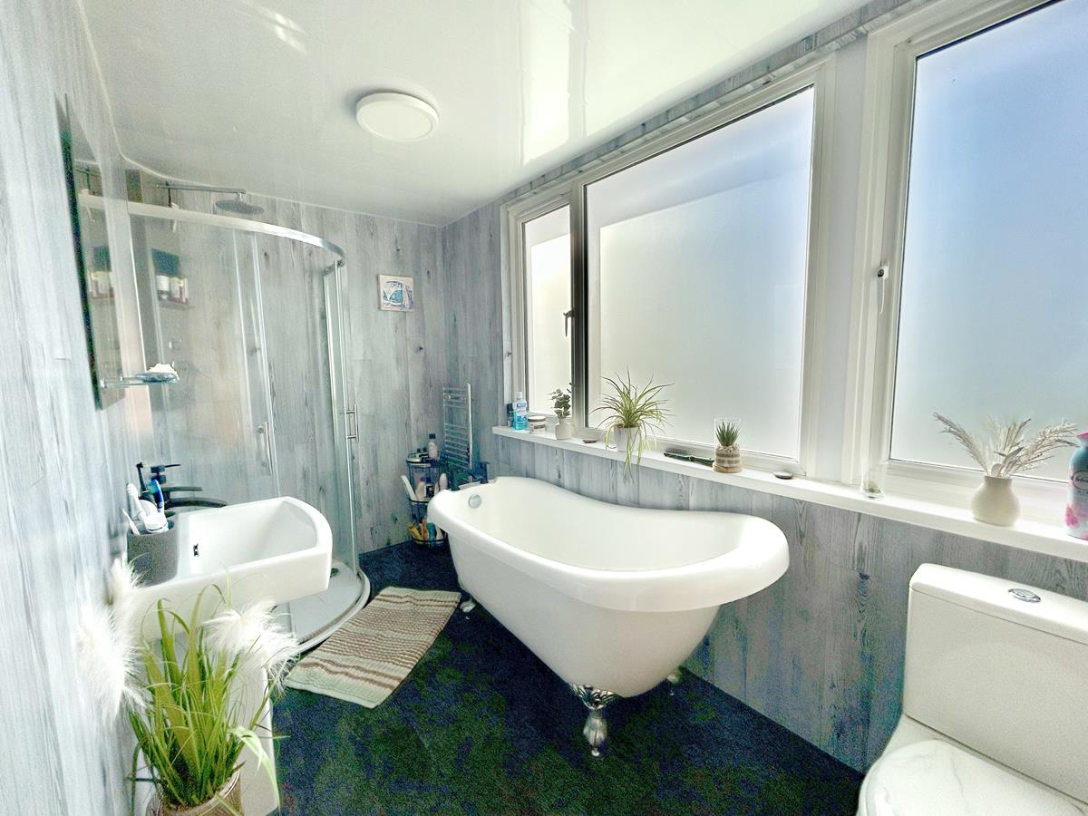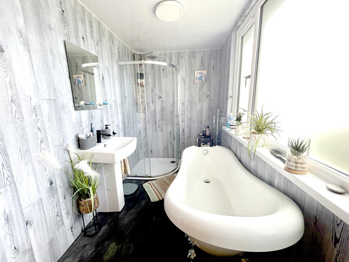 Bathroom - 3.43m x 1.65m (11'3" x 5'4") - Being beautifully appointed with a white suite comprising a freestanding bath, glazed walk in shower cubicle, wash hand basin with mirror over, close coupled W.C. The room has smart easy clean walls and an easy clean roof, stone effect flooring, towel radiator and an obscure glazed window to the rear.