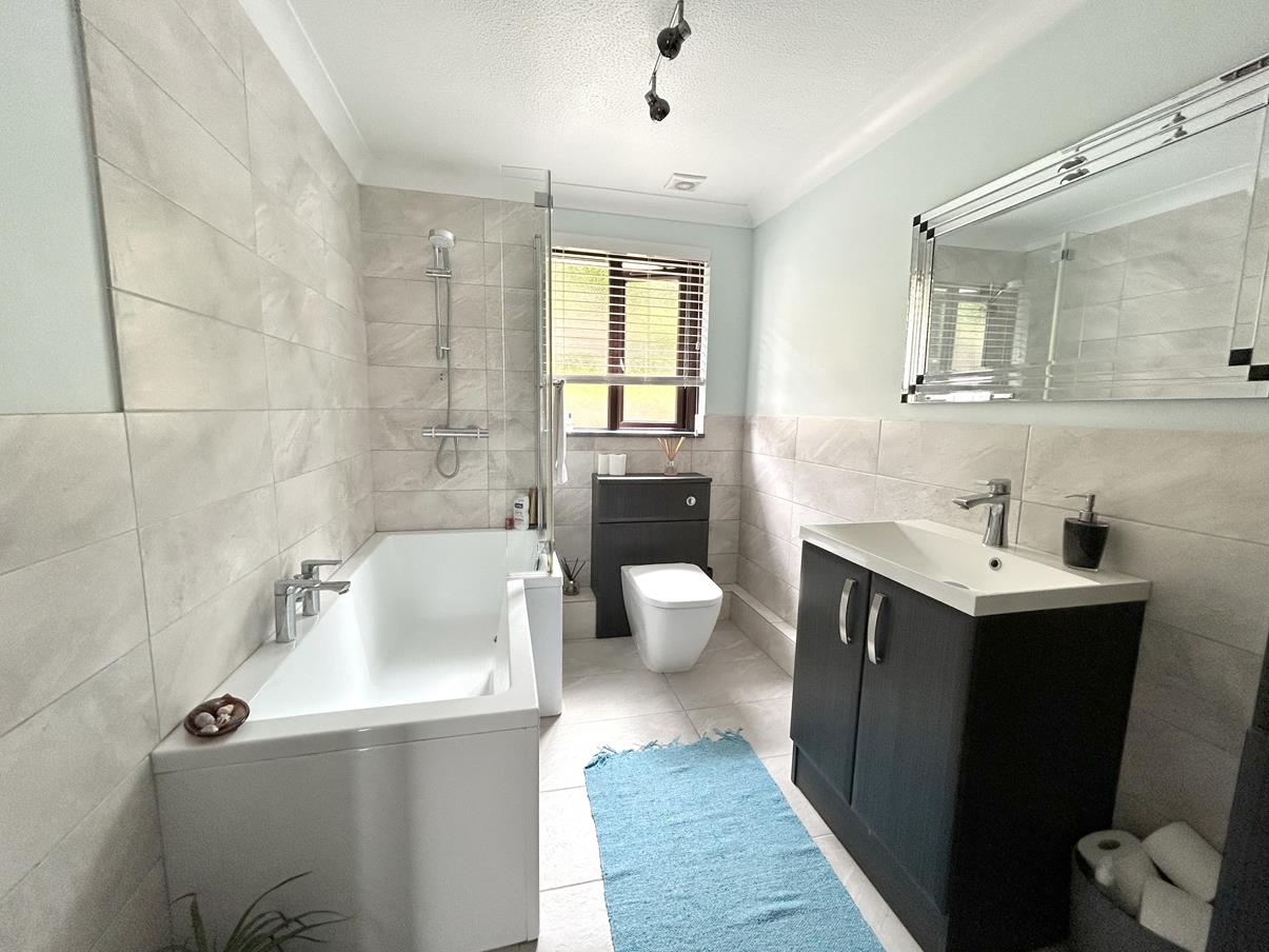 Bathroom - Well appointed with a suite that comprises a 'P' shaped bath with shower over and attractive tiled splashbacks and glass screen. Close coupled W.C. with concealed cistern, wash handbasin set into a vanity unit with storage under, extractor fan, ladder style chrome towel radiator, window to the rear aspect and attractive tiling to the walls and floor.