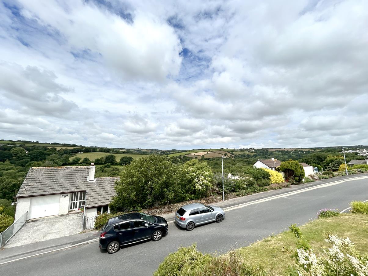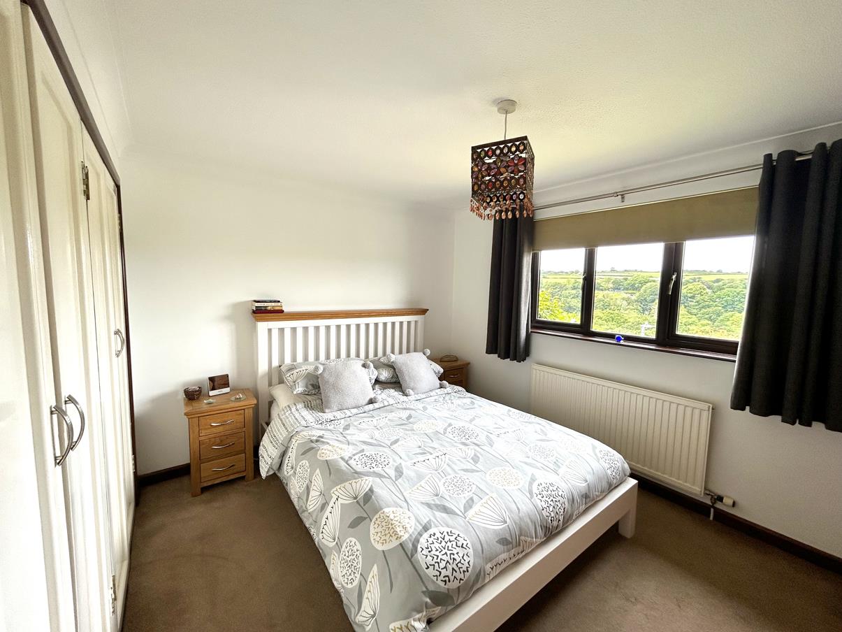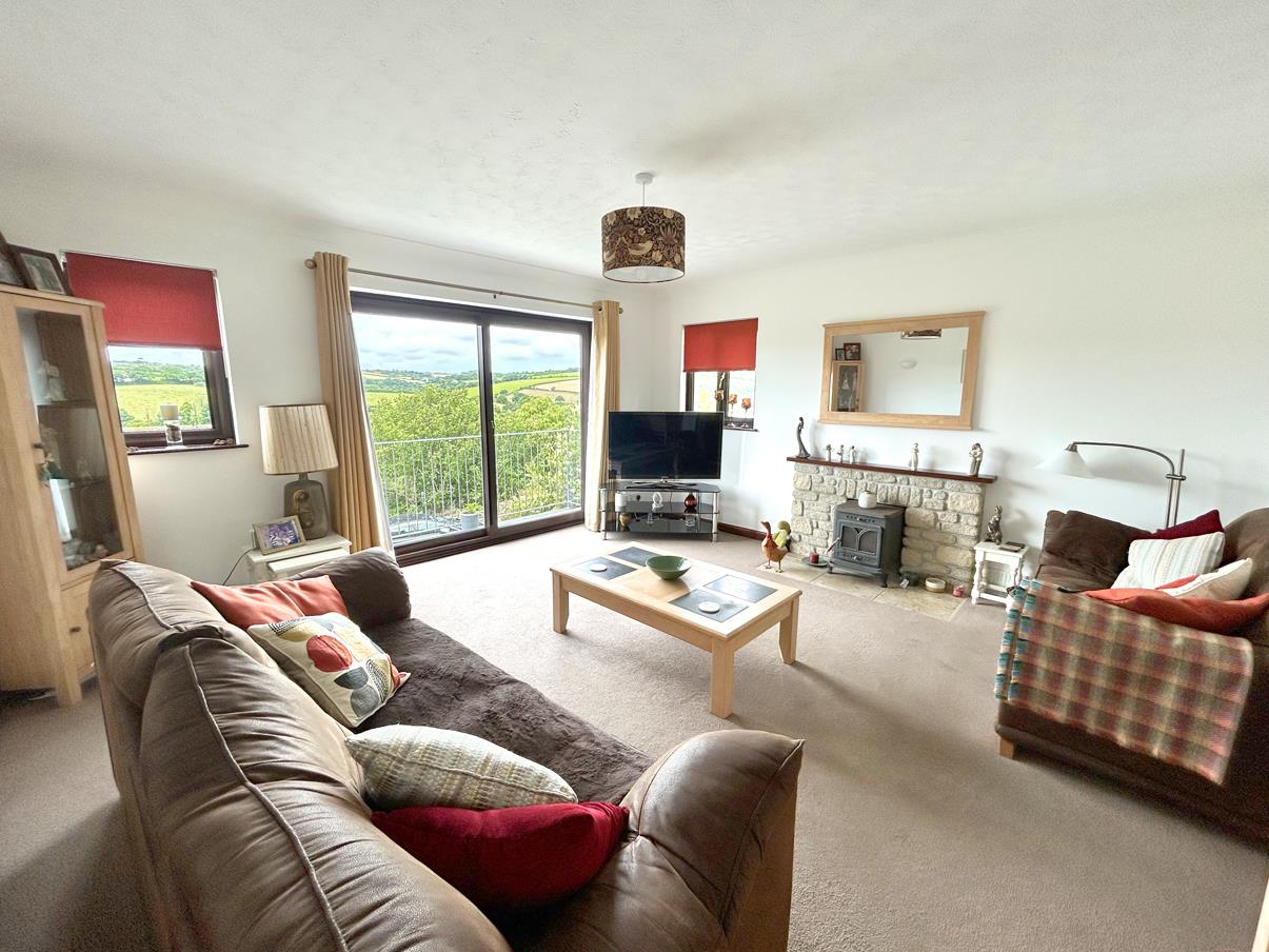 Lounge - 4.83m x 4.57m (15'10" x 14'11") - A lovely space with fireplace with the room being lit by a mixture of wall and ceiling pendant lighting. A glazed sliding door leads out on to the balcony seating area with quite wonderful views, over the top of other properties, the Cober Valley onwards to rolling Cornish countryside beyond. An ideal space to enjoy a sundowner whilst watching the sunset from this westerly aspect.
