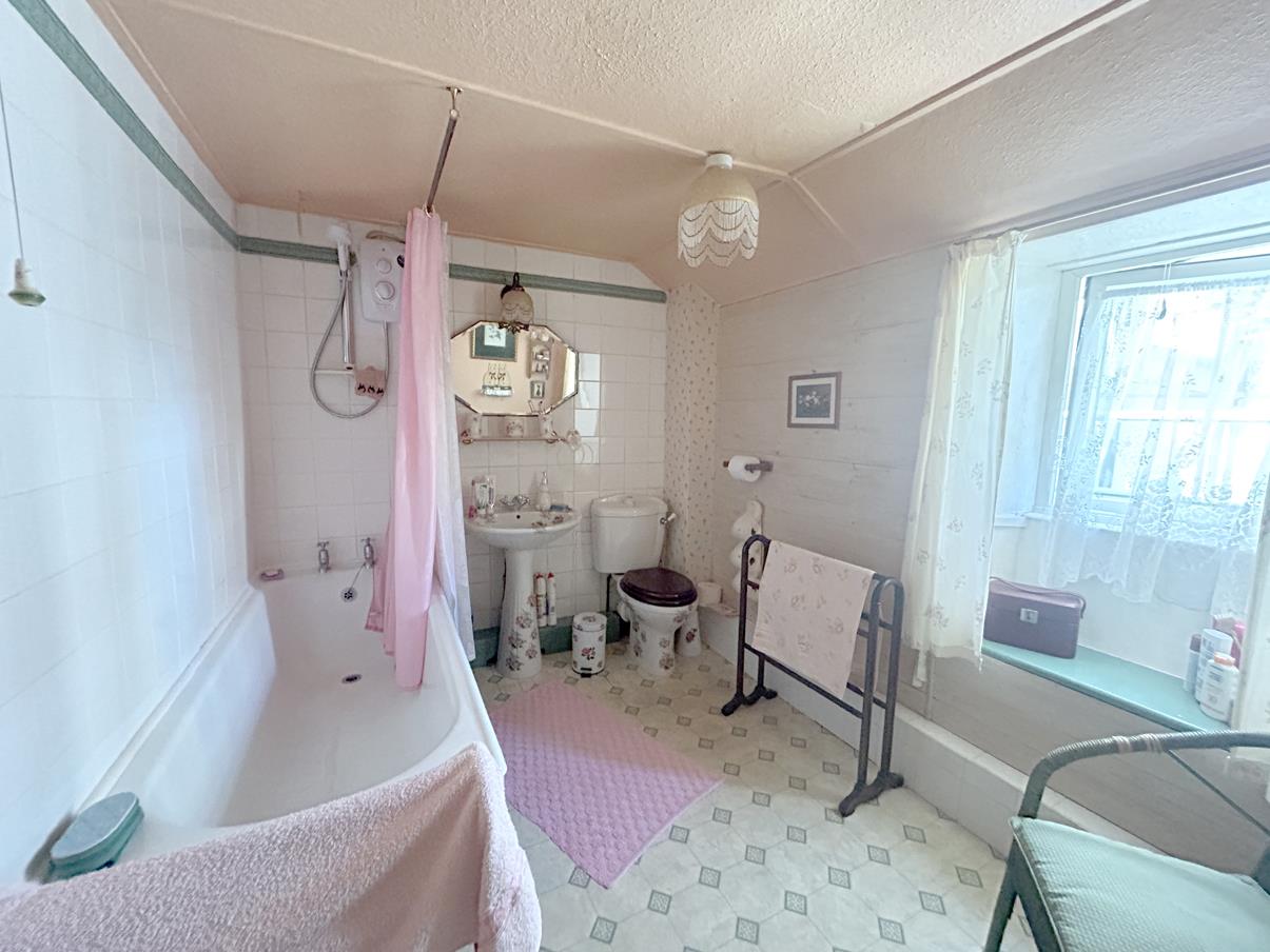 Bathroom - 2.85 x 2.24 (9'4" x 7'4") - The bathroom is fitted with a bath with tiled splashback and an electric shower over, advised new in 2025, a feature wash hand basin and a matching W.C. There is additional tiled splashback, complemented by part wood-panelled walls.