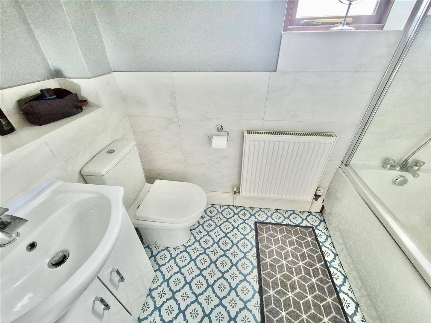 Bathroom - Comprising a close coupled W.C., wash basin with mixer tap over and cupboards under and a bath with mixer tap over with shower attachment. There are partially tiled walls and frosted window to the front.