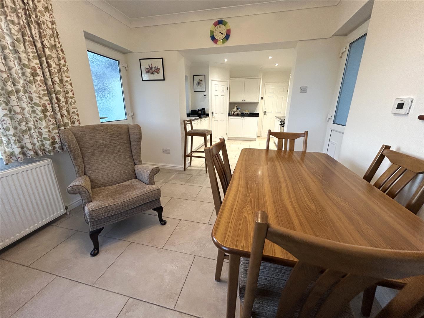 At the dining end of the room, there is a recessed area-currently used to mount a TV-and a remote-control air-conditioning unit for added comfort. Doors lead through to the conservatory, as well as to the rear porch and rear hallway. The space is well lit by a combination of recessed downlighters and an attractive pendant light.