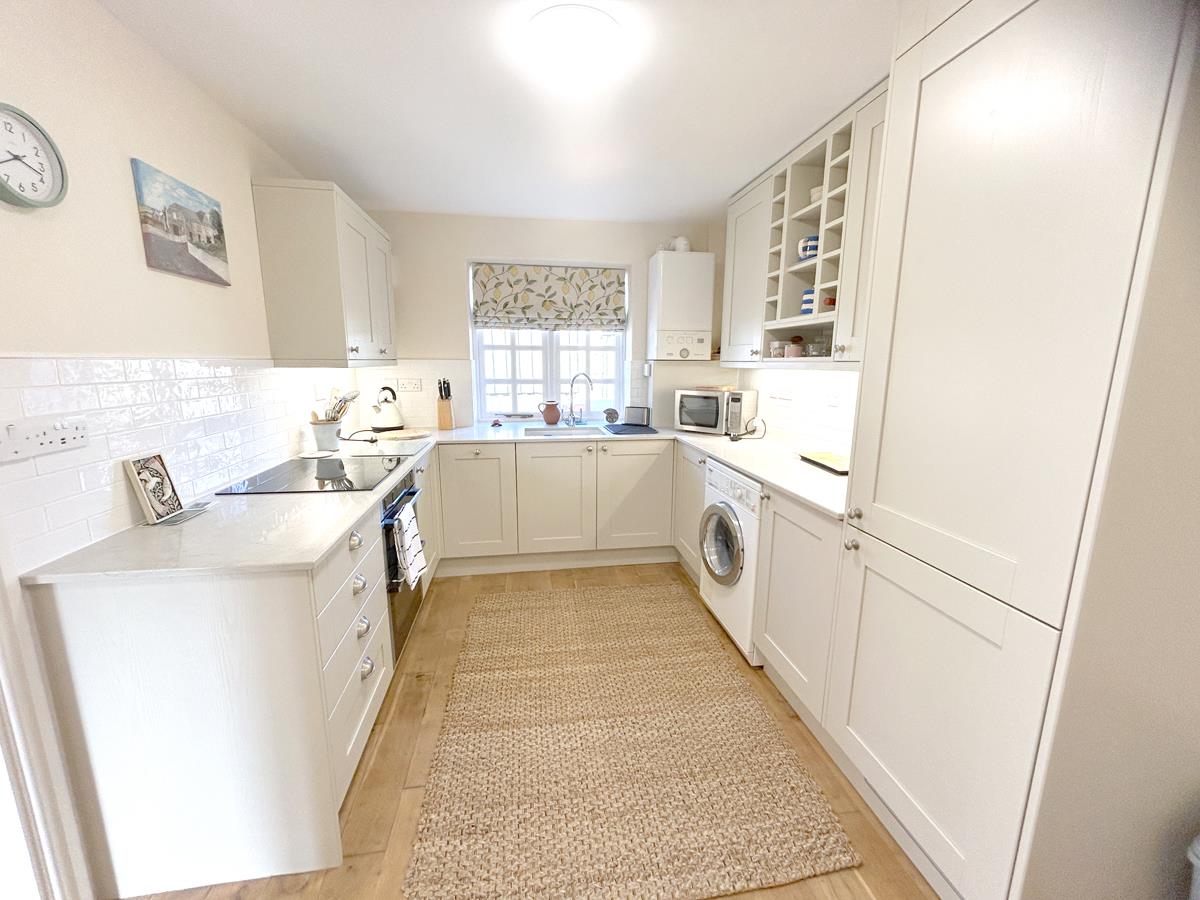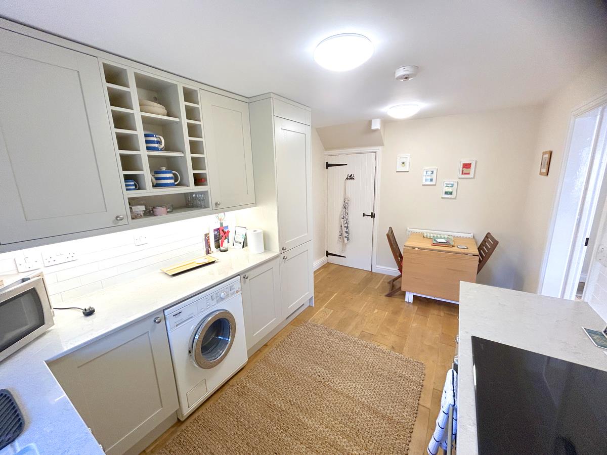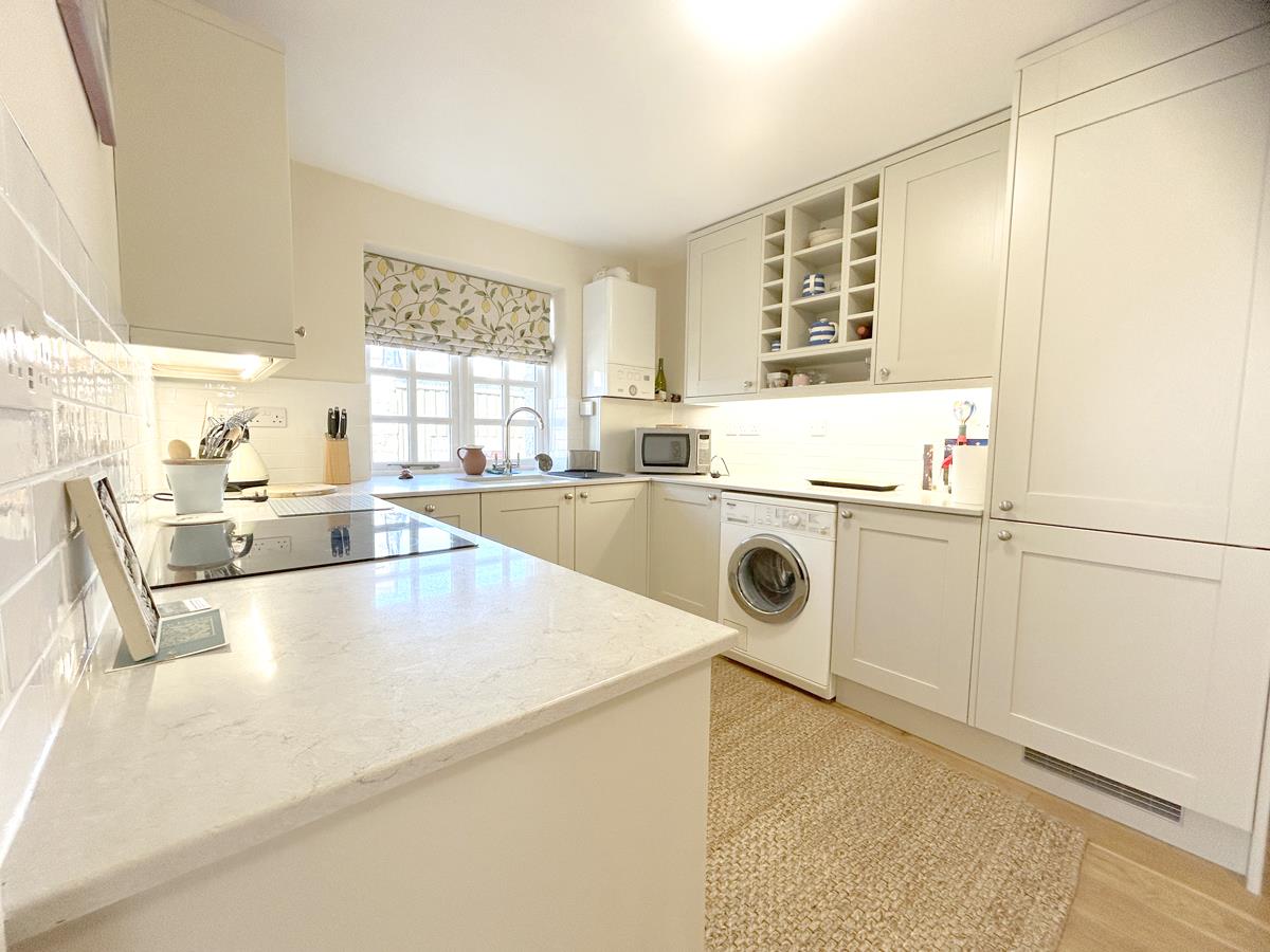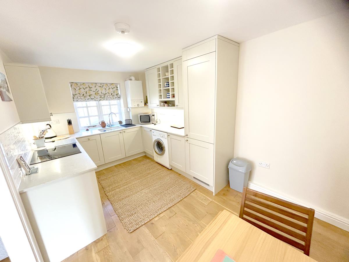 Kitchen / Dining Area - 4.29m x 2.62m (14'1" x 8'7") - With beautiful polished stone working top surfaces incorporating a one and a half bowl ceramic sink with swans neck mixer tap over, inset drainer to side and a Neff electric hob. Complimented by contemporary cabinetry that includes base cupboards and drawers, display shelves and matching wall cupboards. Integrated appliances include a fridge freezer, electric oven and a slimline dishwasher, whilst space is provided for a washing machine. Additional features include corner carousel units, some attractive white 'Metro style' tiling, wood flooring, feature pendant lighting, an extractor, a wall mounted Ideal gas fired boiler, cabinet lighting and windows to the rear aspect. Latched door to useful under stairs storage cupboard with shelving and courtesy light.