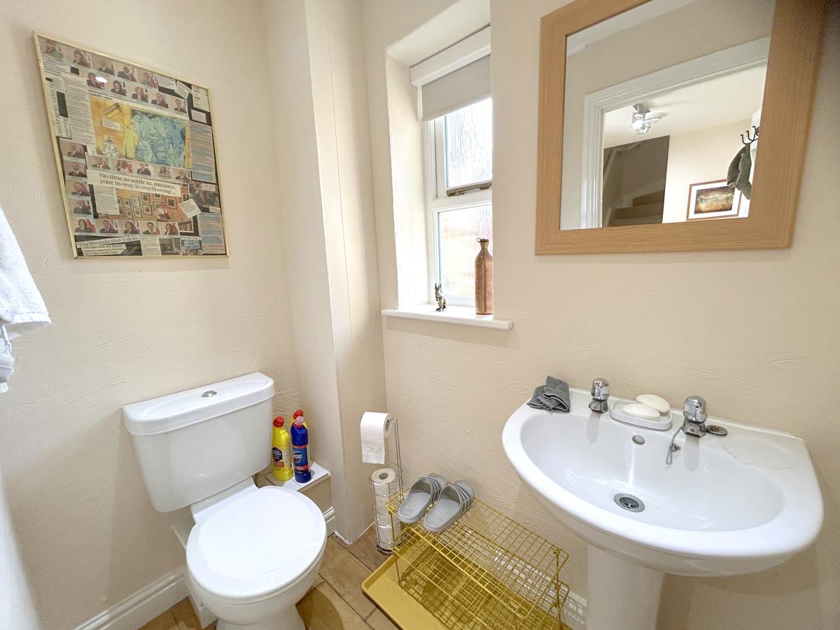 Cloakroom - Having a white low-level w.c, pedestal wash hand basin, chrome ladder style towel rail, recessed spotlighting, wood flooring and obscure glazed window to the side.