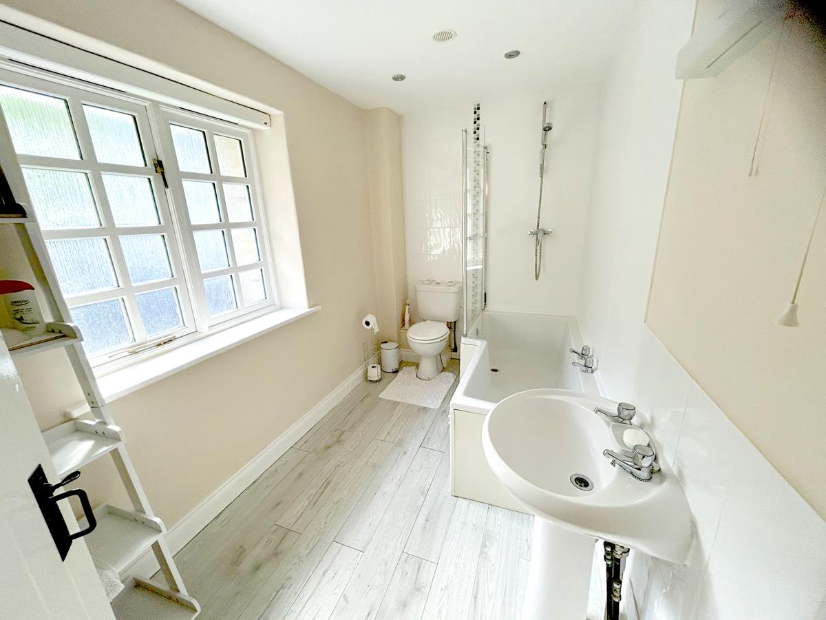 Bathroom - Generously sized and nicely appointed with a white suite comprising a low-level w.c, pedestal wash hand basin and a 'P' shaped panelled open ended bath with shower screen and thermostatic shower. There is a chrome ladder style tile rail, recessed spotlighting, shaving point/light, attractive tiling to some walls, luxury grey wood effect flooring and obscure glazed windows to the front aspect.