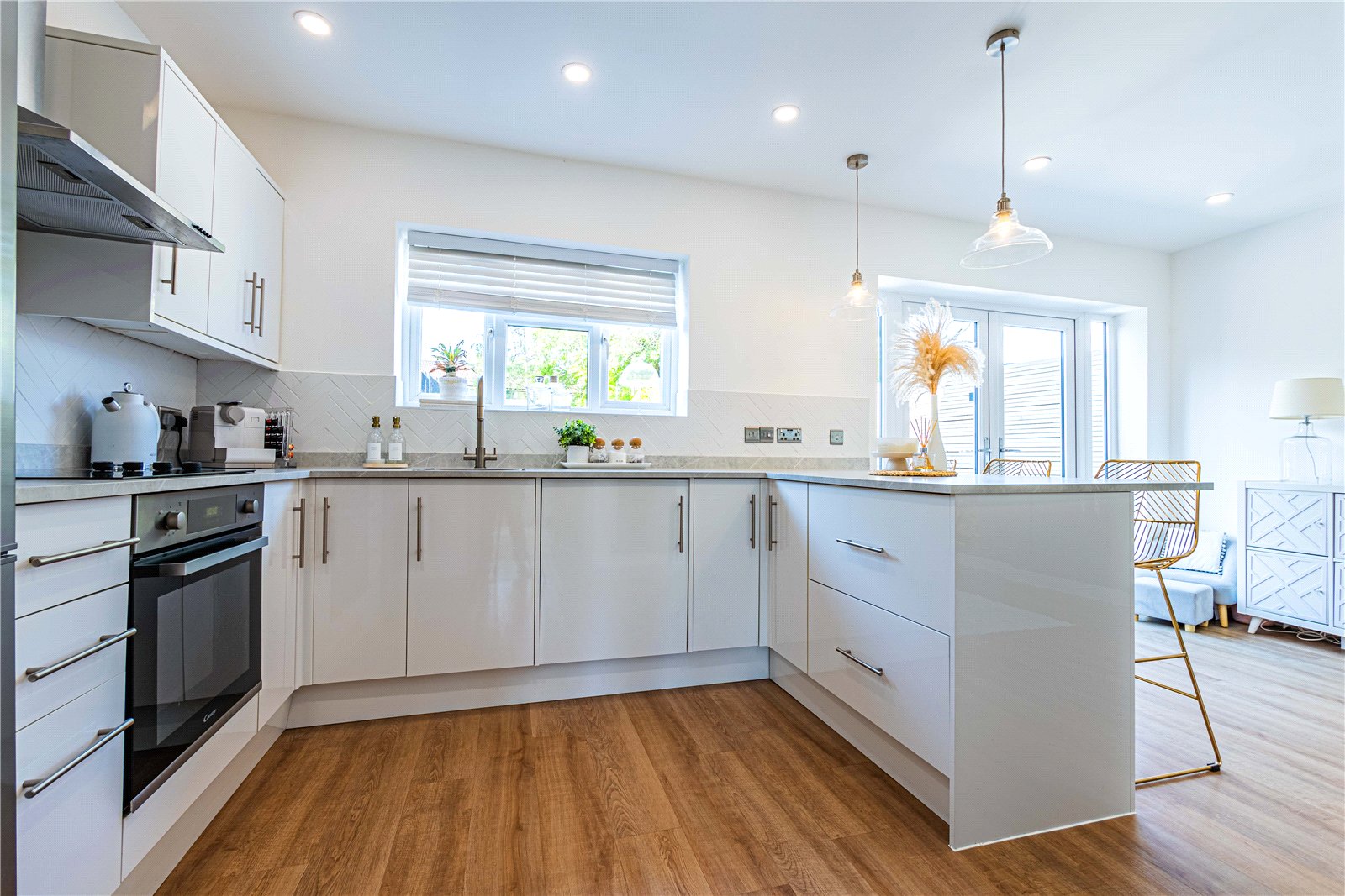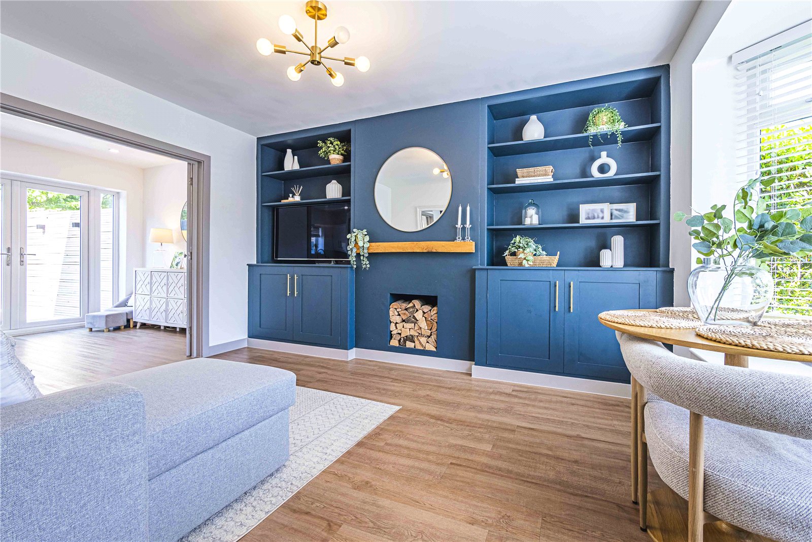 The heart of the home is the modern, open plan kitchen diner with high-end appliances, ample storage, and a sleek design. Double doors from this area open into the cozy living room that provides a welcoming space for relaxation and entertainment.