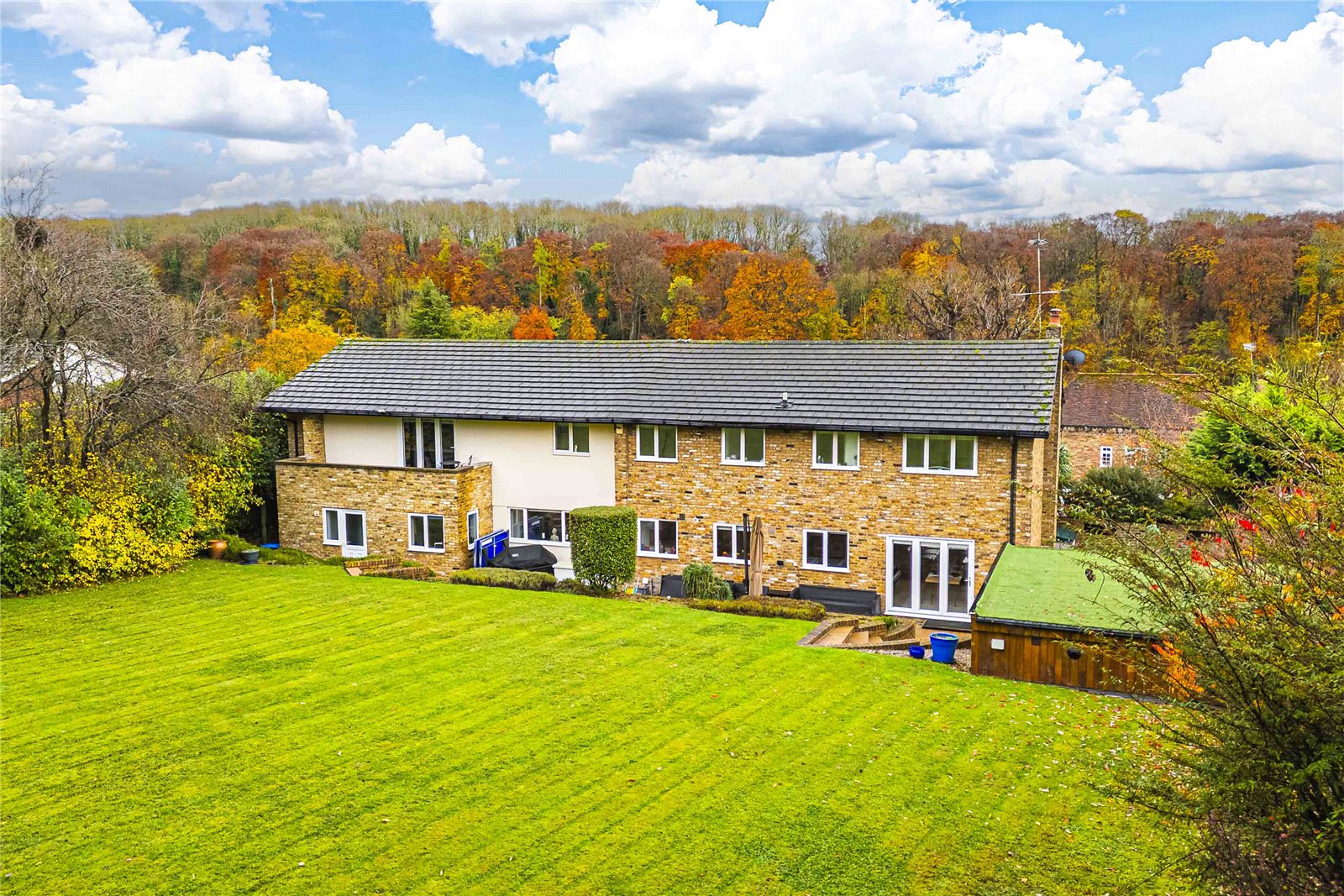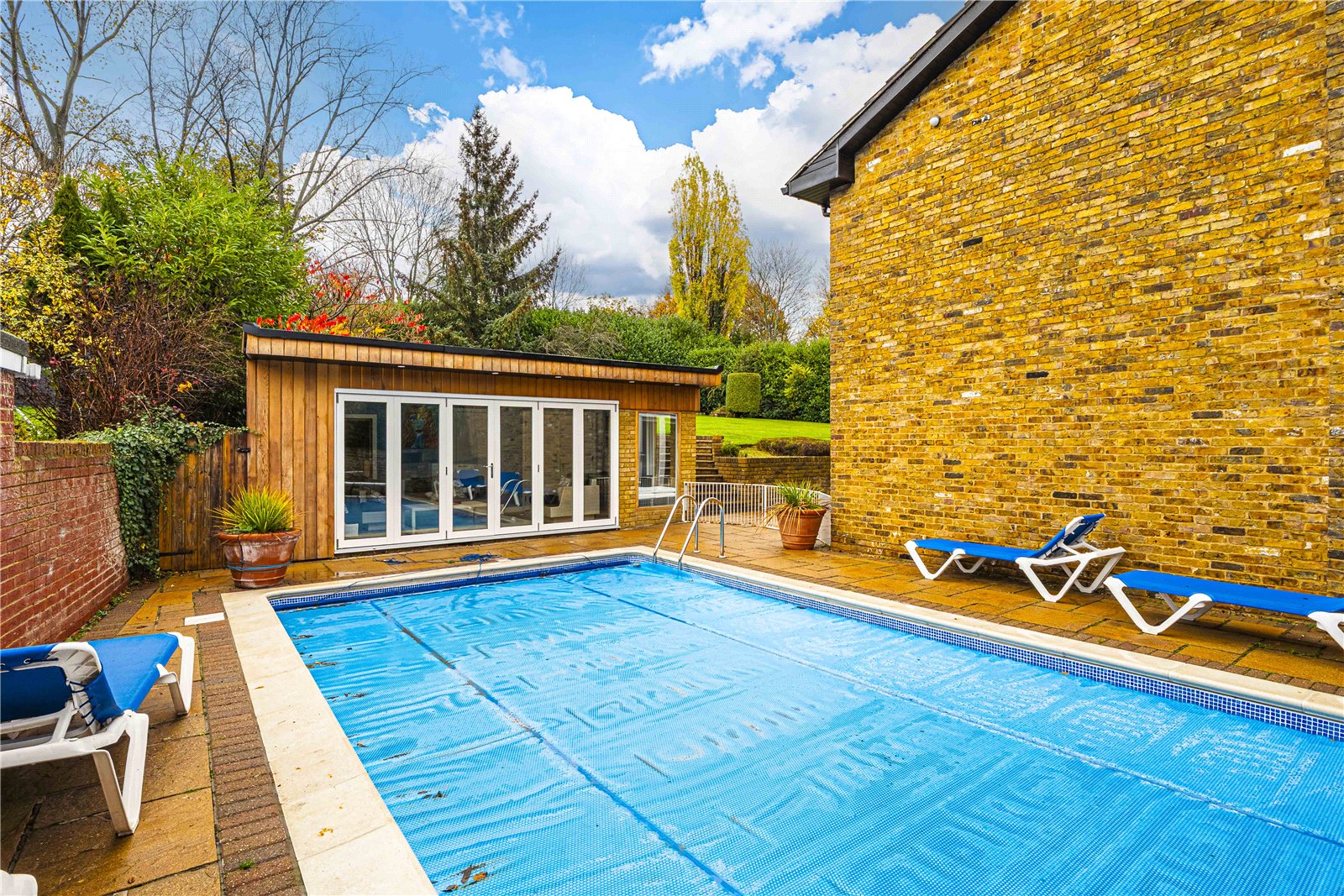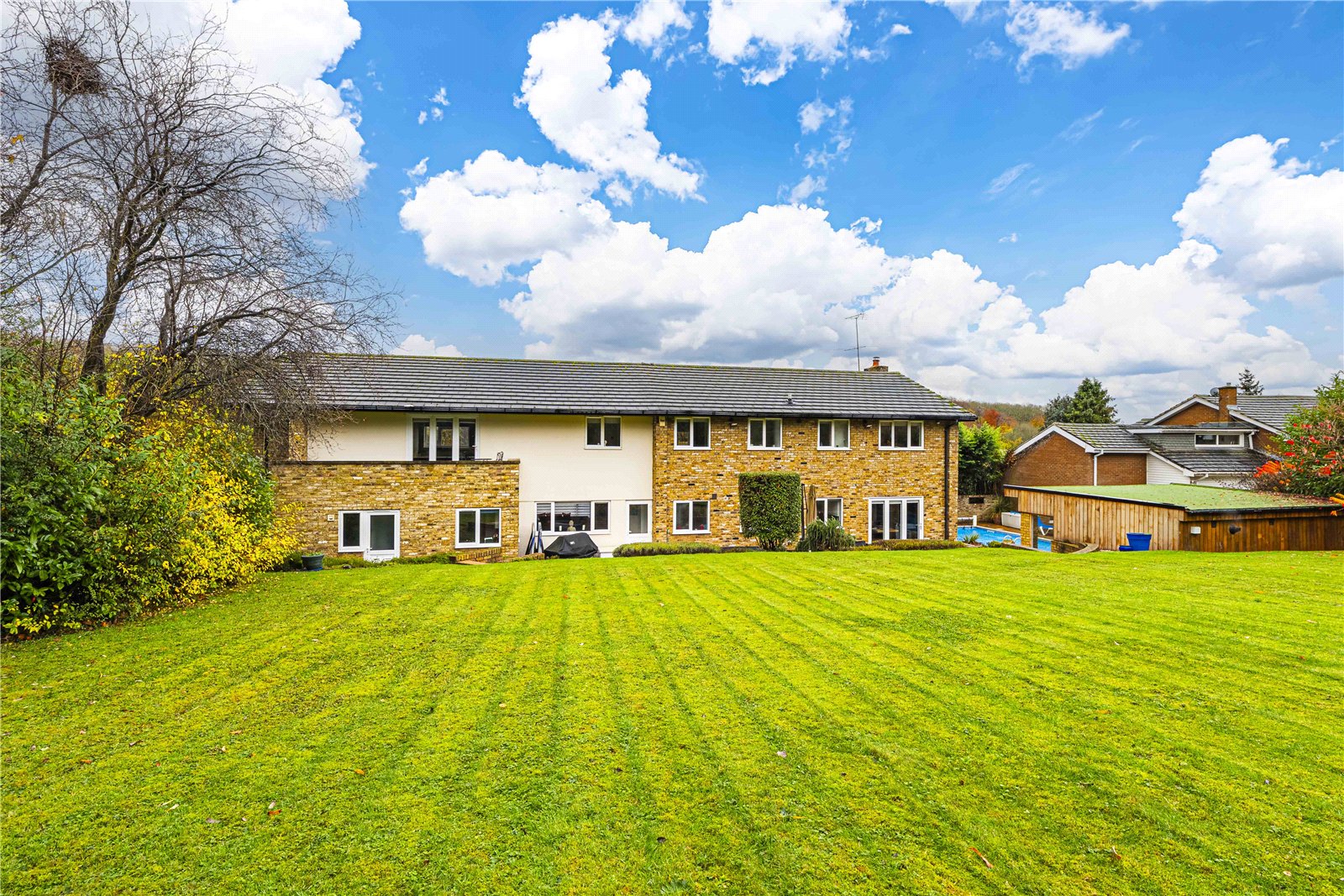 Detached Family Home in the Prestigious Longdean Park Estate.Set within the highly desirable Longdean Park private estate, this impressive detached residence offers generous and flexible accommodation, blending classic proportions with contemporary finishes throughout.A substantial driveway provides ample off-street parking and leads to a double garage with an automatic door. The welcoming entrance hall opens into a series of well proportioned reception spaces, including a bright principal sitting room featuring a large bay window.The ground floor further comprises a guest cloakroom, a modern fitted kitchen with integrated appliances, and a utility room with direct access to both the study and the garage, ideal for family living and home working.To the first floor, the principal bedroom enjoys an en suite bathroom, a dressing room, and access to a private roof terrace overlooking the garden. Two additional bedrooms benefit from en suite shower rooms, while three further bedrooms are served by a well appointed family bathroom.The mature rear garden offers a high degree of privacy and features a heated swimming pool and paved terrace, providing an excellent setting for outdoor entertaining. A well-equipped pool house includes a sauna, pool room, and storage, while a separate shower room near the garage adds further convenience.Residents of Longdean Park benefit from a beautifully maintained setting, overseen by an active residents' association.