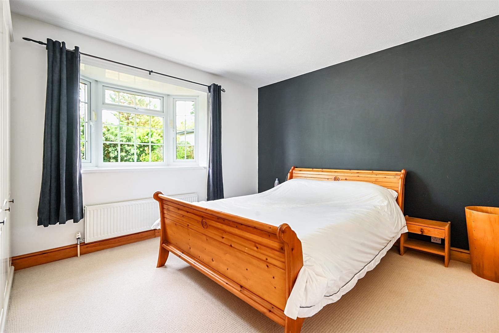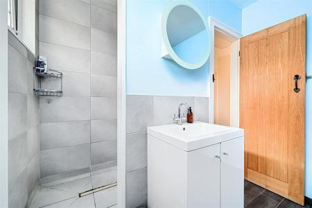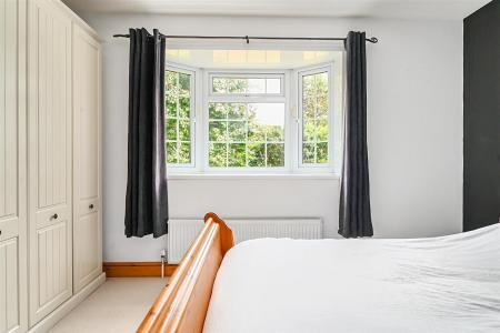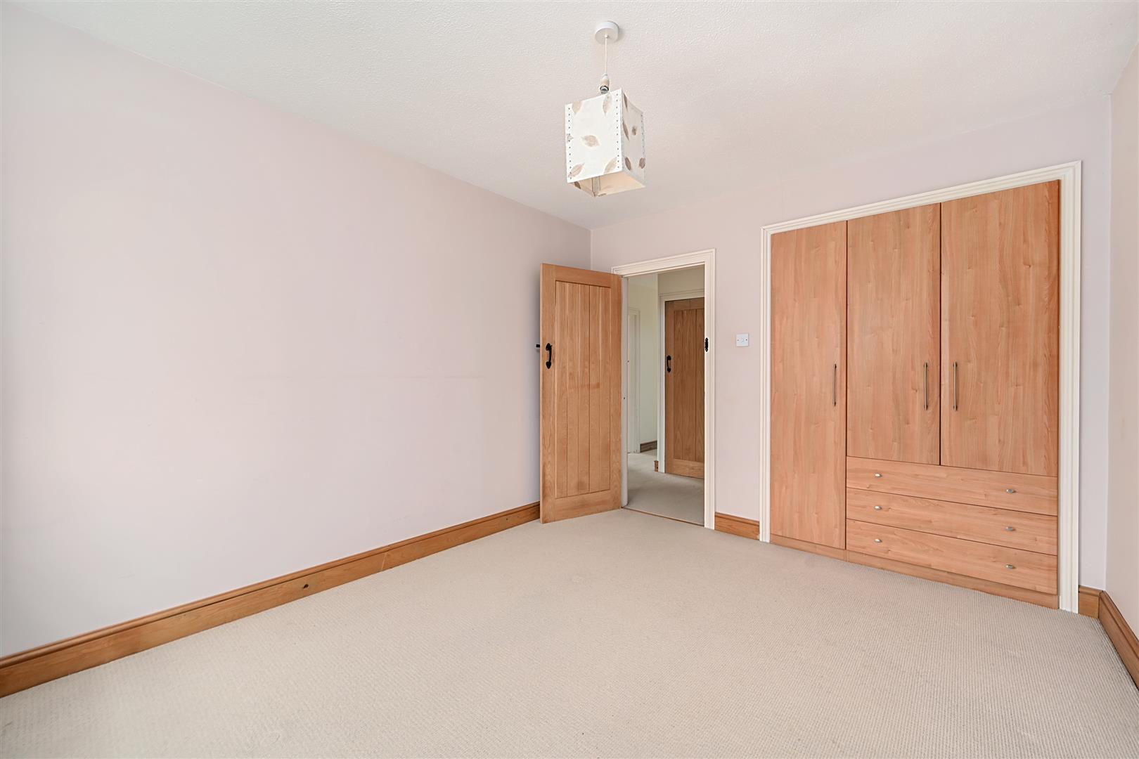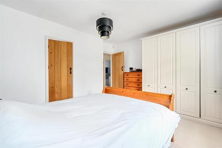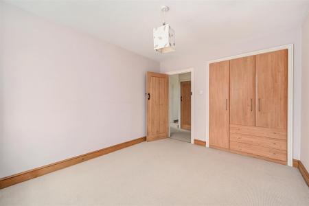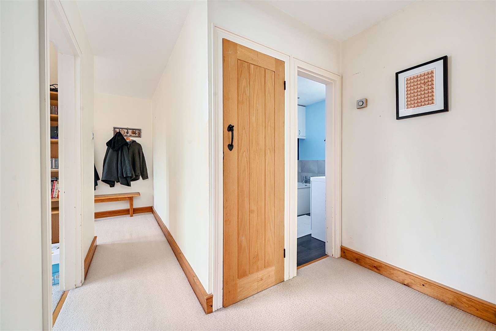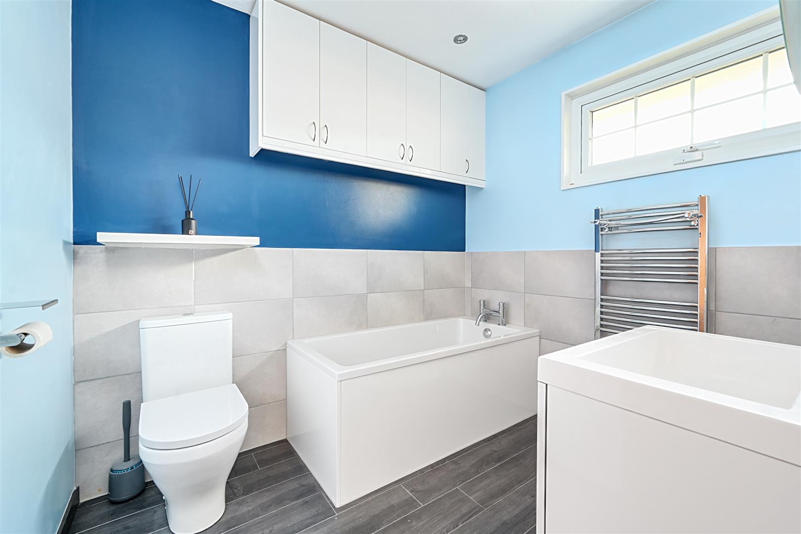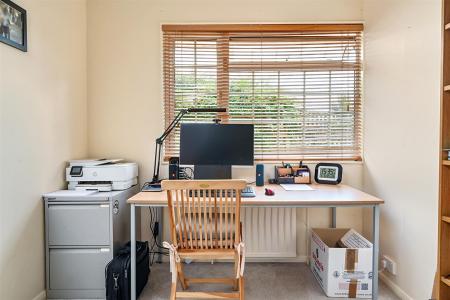 Along the hallway, the main bedroom benefits from an en-suite toilet, while the second double bedroom includes fitted wardrobes. The third, smaller double bedroom is currently used as a home office. Additionally, there is a full family bathroom, finished with a half-tile pattern.