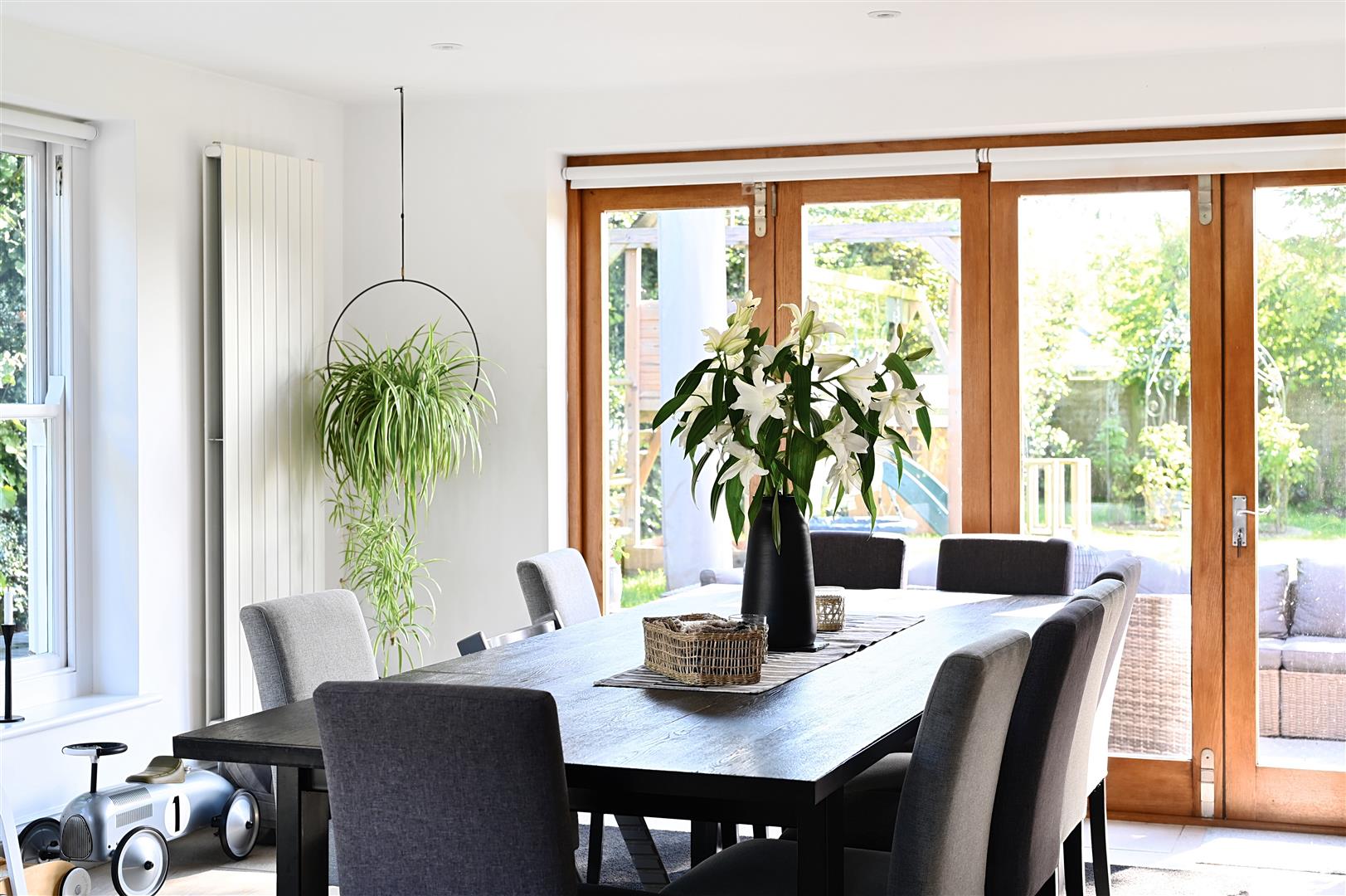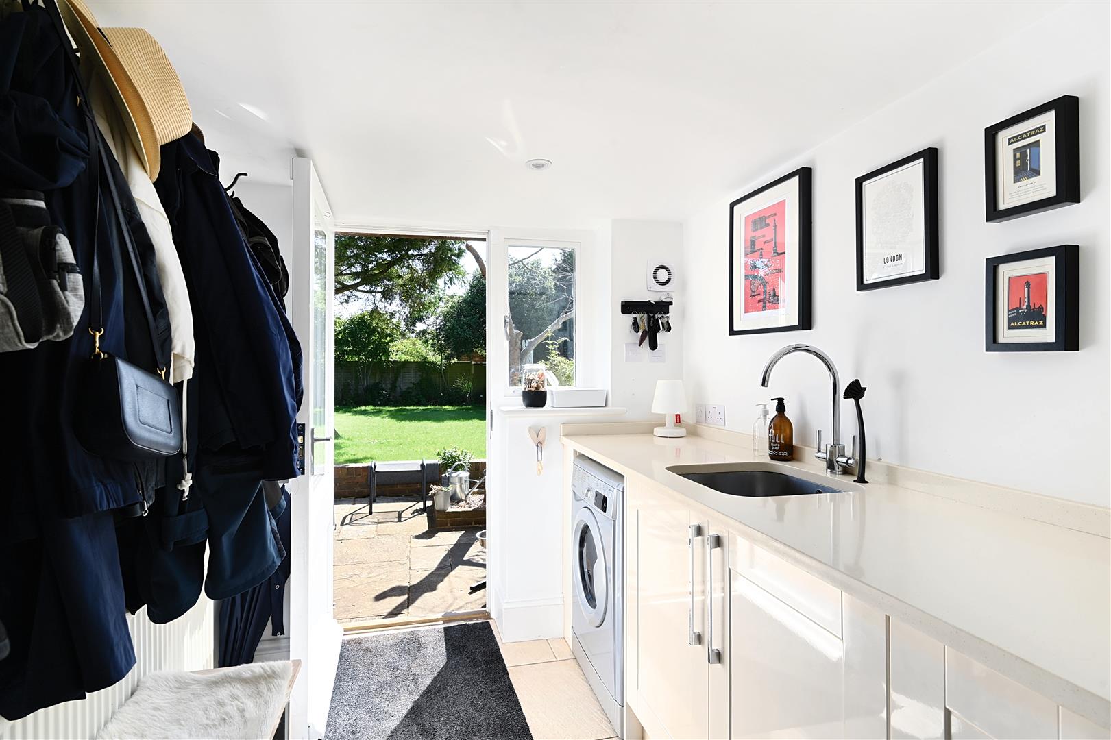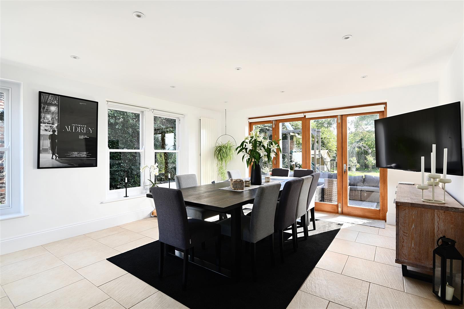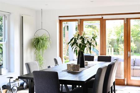 The open plan family room opens directly onto a large terrace and additional patio areas, via floor to ceiling folding doors giving views of the garden. A separate utility room with granite surfaces and deep sink provides a washing machine, additional storage and space for a free-standing freezer. The utility room can be accessed via the open plan extension or directly from outside the house.