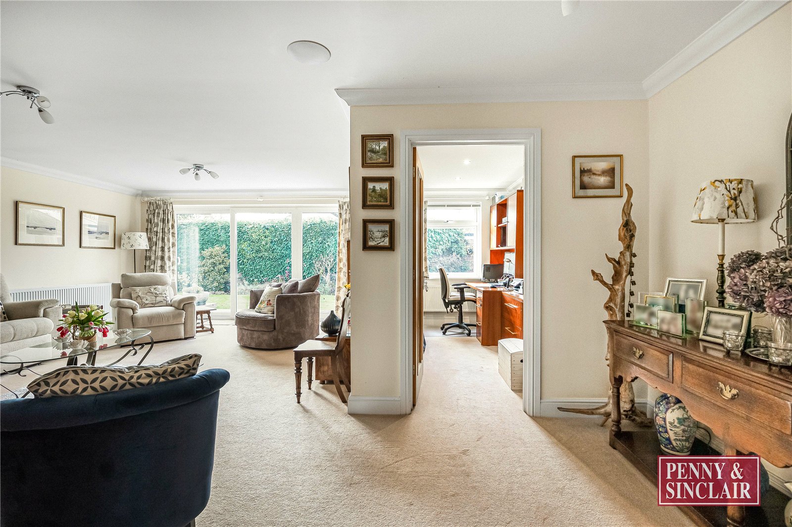 The sitting room is an elegant and spacious area, styled with warm tones, a feature open fireplace and floor to ceiling glazed sliding doors that enhance the airy feel. A separate study offers the ideal space for working from home.