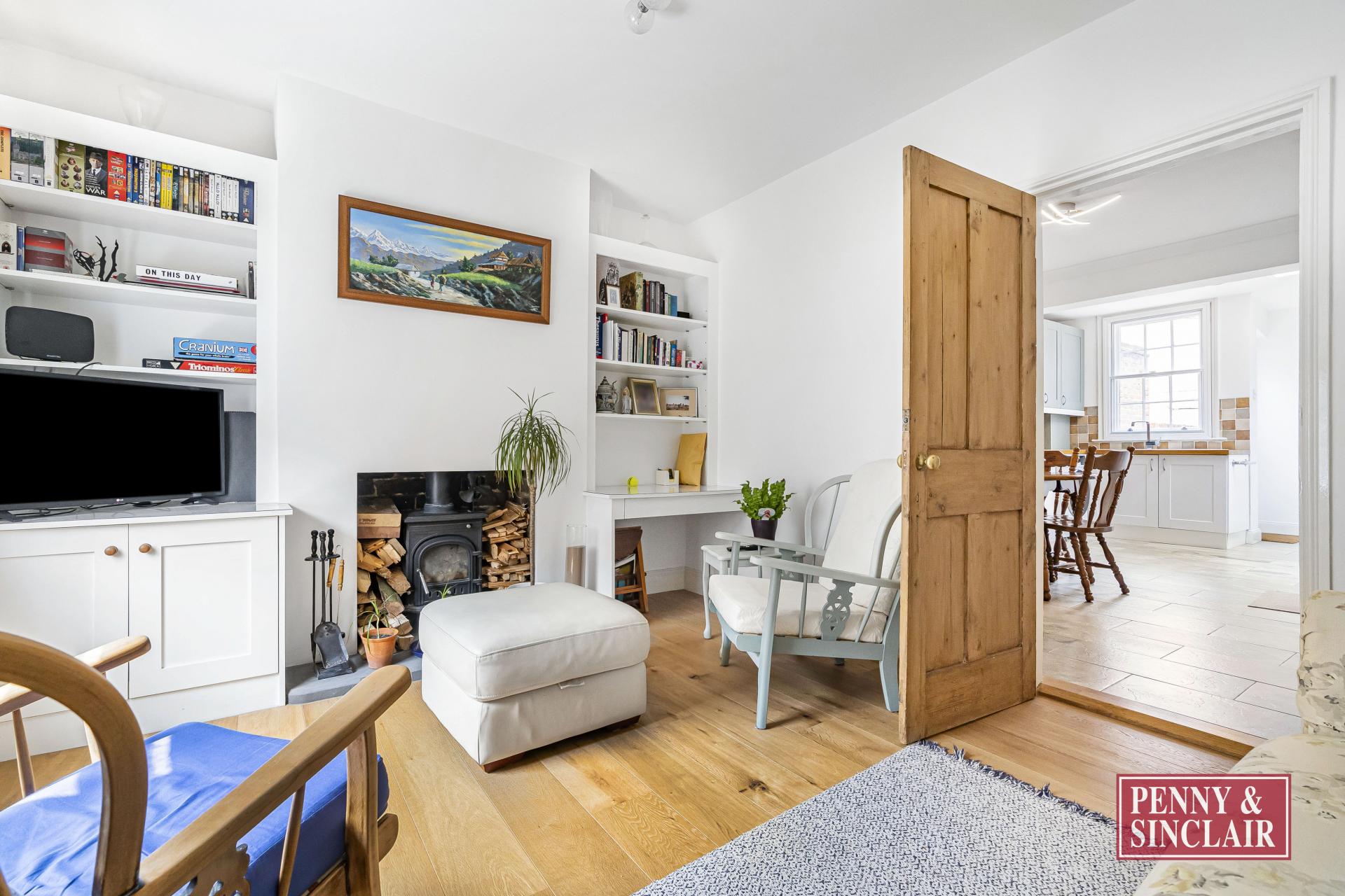 ACCOMMODATION As you step through the front door, you are greeted by a separate sitting room, an elegant space flooded with natural light. The wooden floors and fireplace with wood burning stove create a warm and welcoming ambiance.