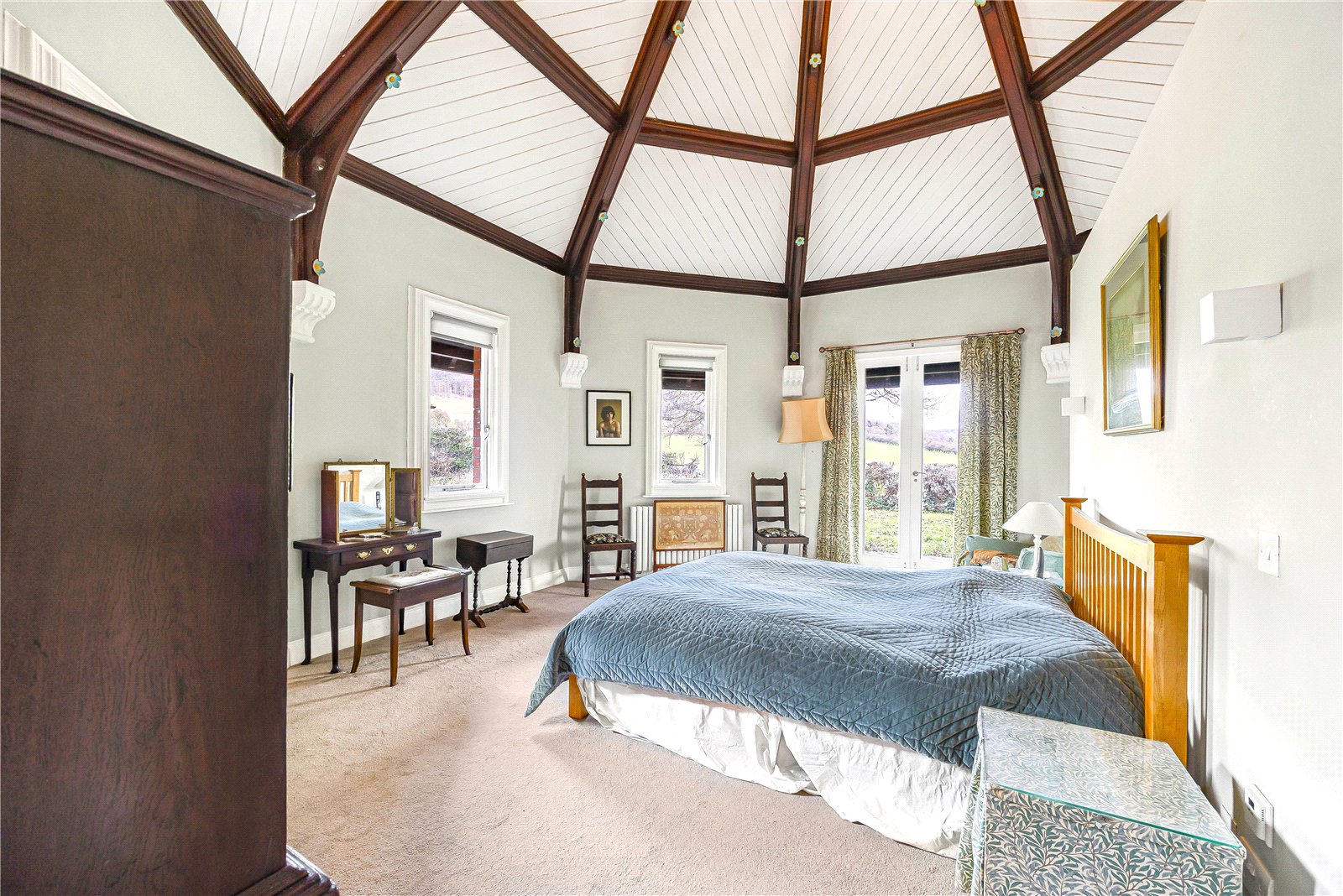The principal bedroom is a standout feature of the house; a striking vaulted octagonal room - converted from the original Victorian dairy - that blends architectural drama with a calm, restful atmosphere. Exposed timber detailing, generous proportions and views over the garden and country beyond create a genuinely special space, complemented by a walk-in wardrobe and en suite. There are three further bedrooms, two having en suite shower rooms, a large family bathroom and a study with exceptional views to the front. Altogether the accommodation uses space efficiently to offer excellent flexibility for family, guests or home working.
