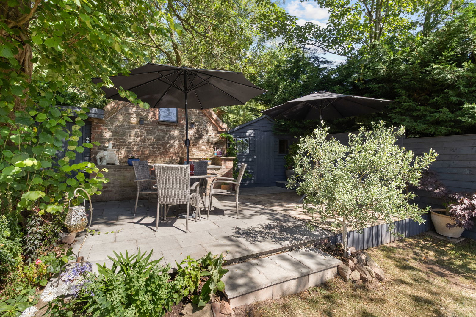 Stepping out from the kitchen onto a paved patio with outside Belfast sink and taps with a stylish tiled backsplash. steps up onto an area laid to lawn with a gentle slop to the top of the garden. A range of mature shrubs and trees with a striking view across to Perton Hill. The top of the garden is host to a further patio and decked BBQ area with bench seating in front of a former Piggery stone outbuilding which acts as a useful storage facility with the potential of further development. A gate leads to a sloped front garden which is laid to lawn with well stocked and mature borders, a raised shrub planter and Green house.