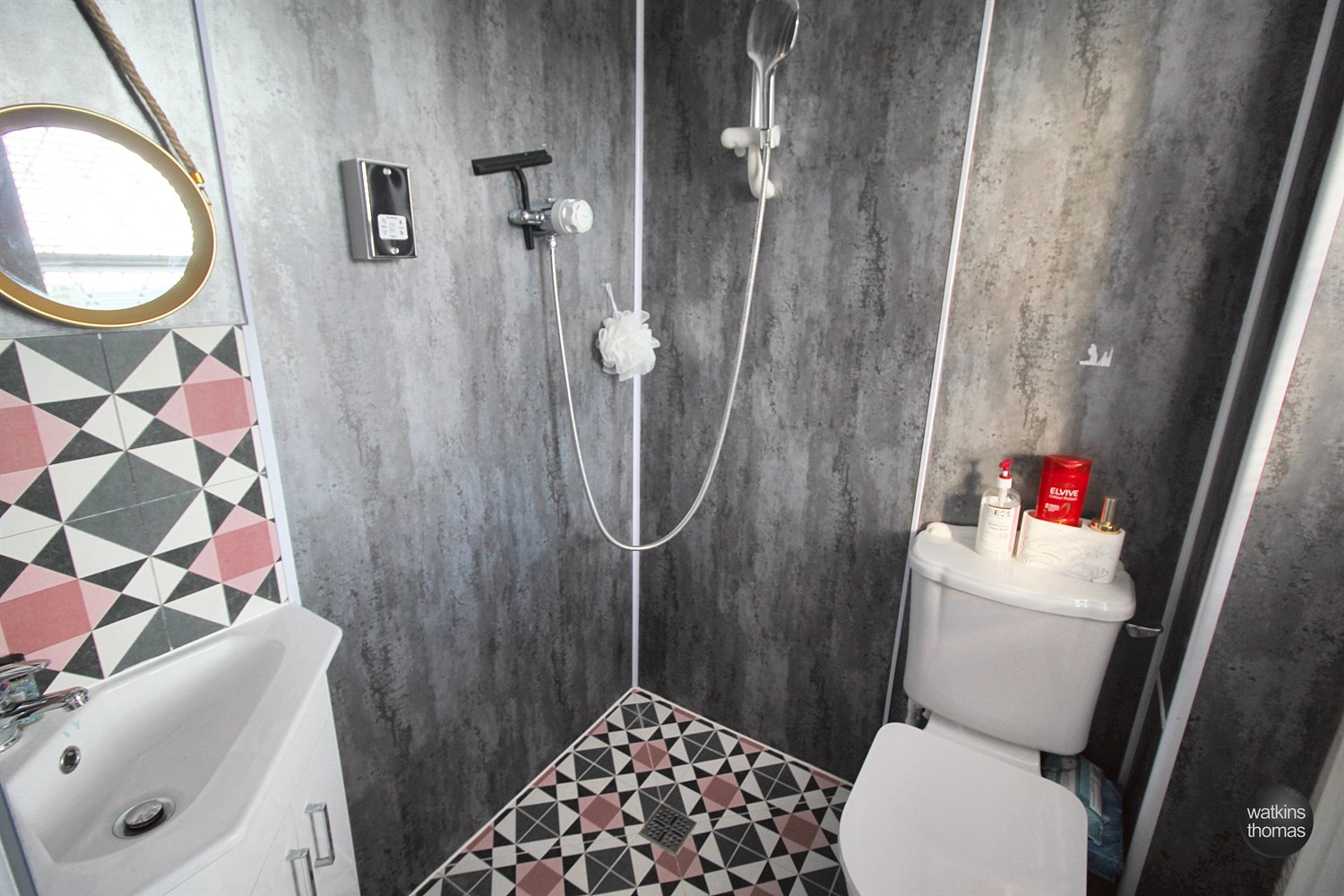 With front aspect double glazed window, thermostatically controlled shower with shower boarded surround, vanity wash hand basin with tiled splash back, low flush wc, tiled flooring, panelled radiator and extractor fan.