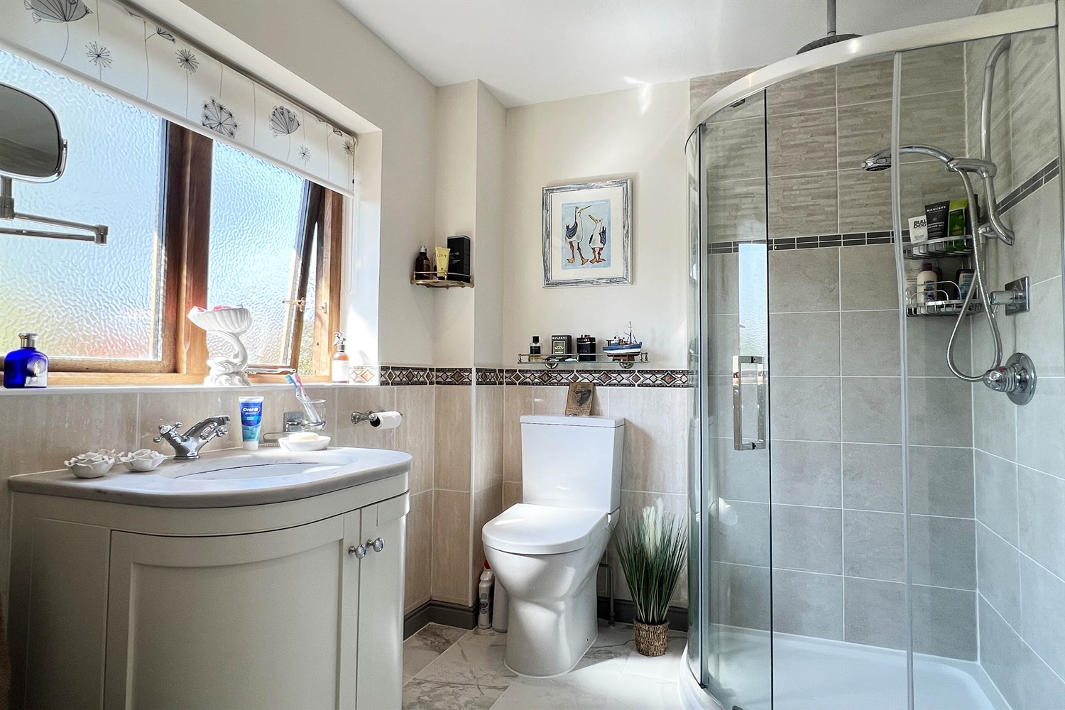Beautifully appointed with white suite comprising bath with mixer tap, separate walk-in shower cubicle with twin headed shower unit and tiled surround, vanity wash basin with cupboards below and mixer tap. Further fitted cabinets and low level wc. Ladder type radiator, extractor unit and double glazed window with wooden surround. Feature tiled floor.