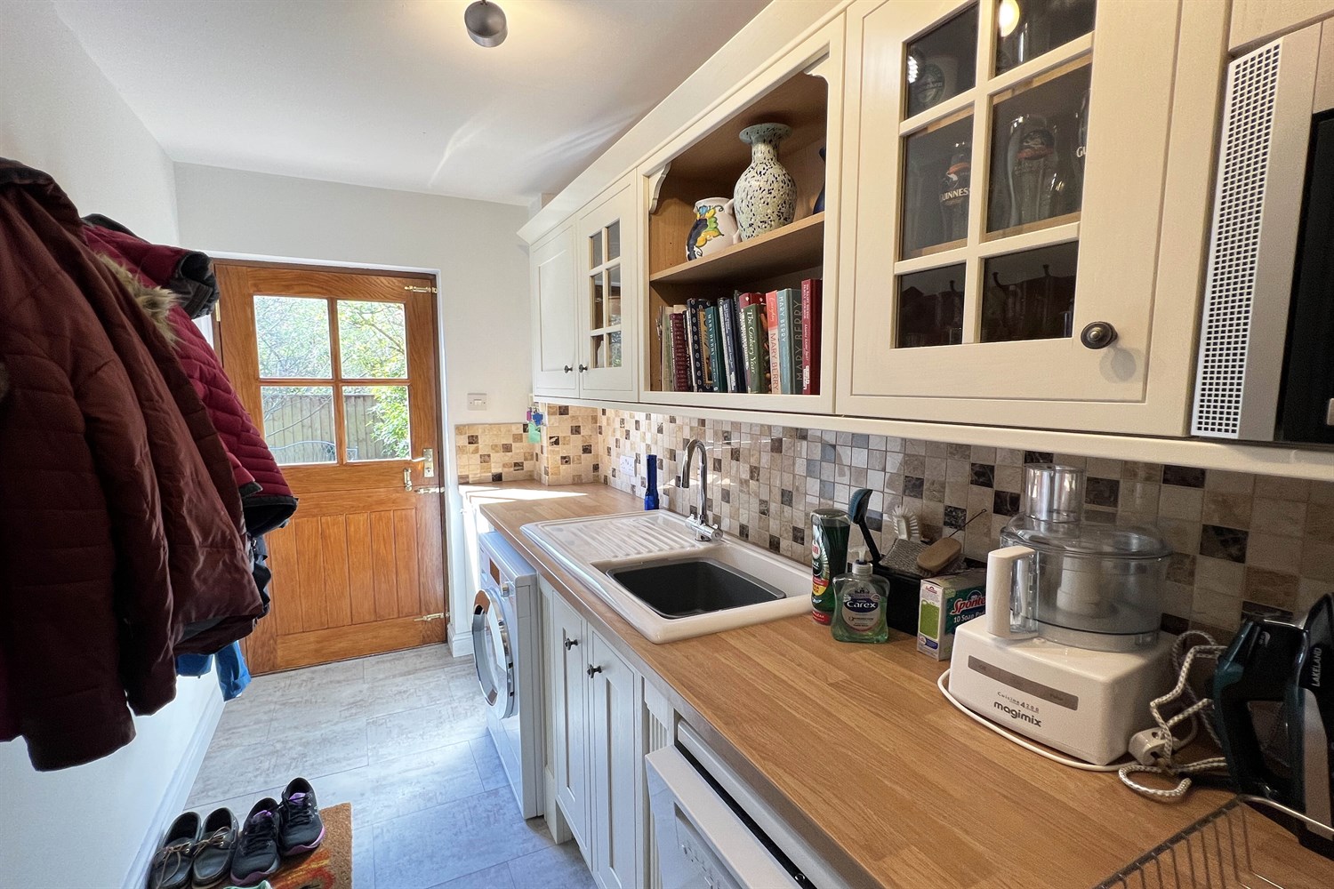 With a stable door with glazed upper panels to the rear garden and with an enamel sink unit with drainer and mixer tap and a range of fitted base cupboards with wood block working surfaces over, tiled surrounds and matching eye level cabinets including glass fronted units. Recess for appliances, low level heater, mixer tap and tall storage cupboard. A continuation of the tile effect flooring and with a door to the garage.