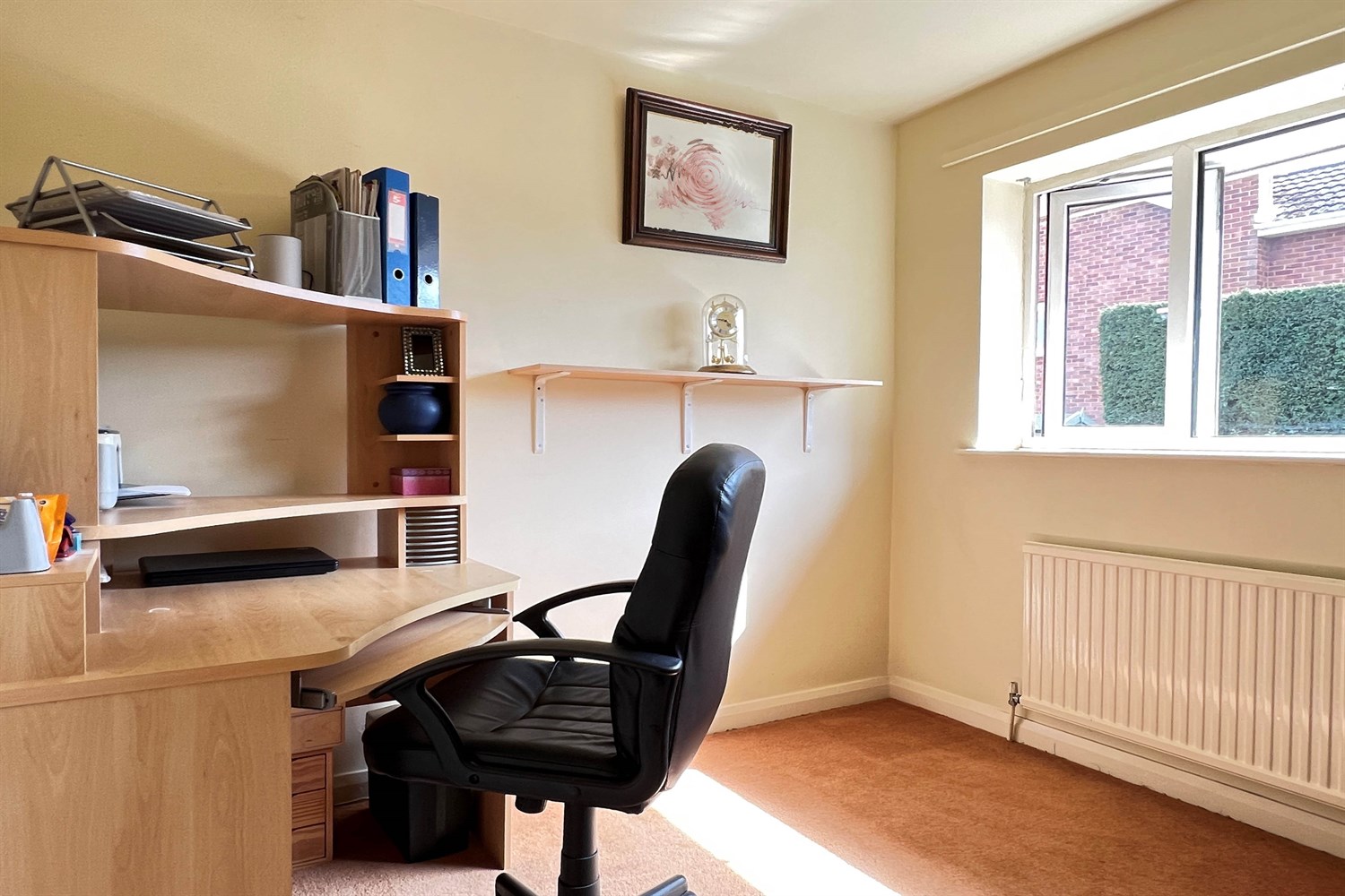 With a double glazed window to the front with vertical blind with view across roof tops to rising tree lined countryside. Along one wall there is a run of four double wardrobe cupboards with cabinets over three. Radiator.
