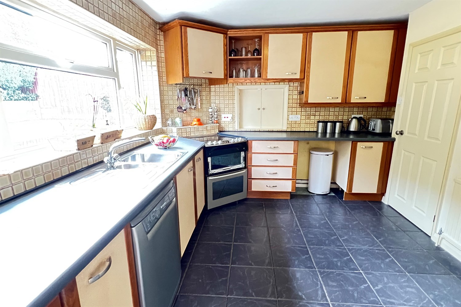 With a double glazed window to the rear and base cupboard and drawer units with roll edged working surfaces over, tiled surrounds and matching eye-level cabinets including an open fronted unit. One and a half bowl stainless steel sink unit with drainer and mixer tap, recess with plumbing for dishwasher, recess for cooker with cooker hood over and recess for fridge. Radiator and ceramic floor tiles which continue through to the: