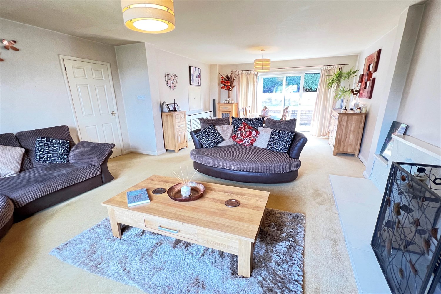 With a double glazed window with vertical blinds to the front, radiator, painted stone fire surround with living flame gas fire, pair of double glazed sliding patio doors to the south facing rear garden, further radiator with cover and serving hatch from kitchen.